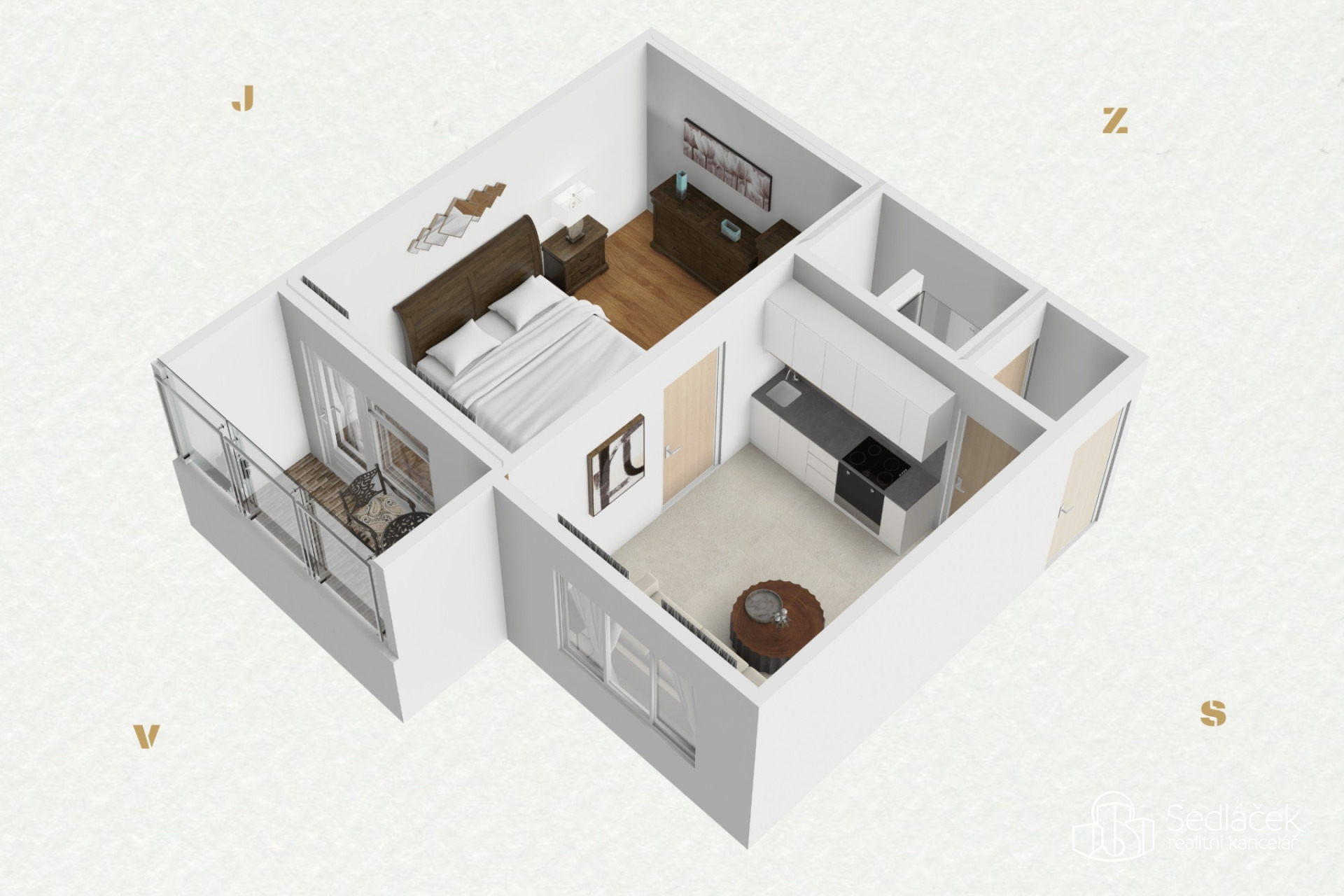 Dispozice bytu tvoří samostatná kuchyň, pokoj a koupelna s WC.