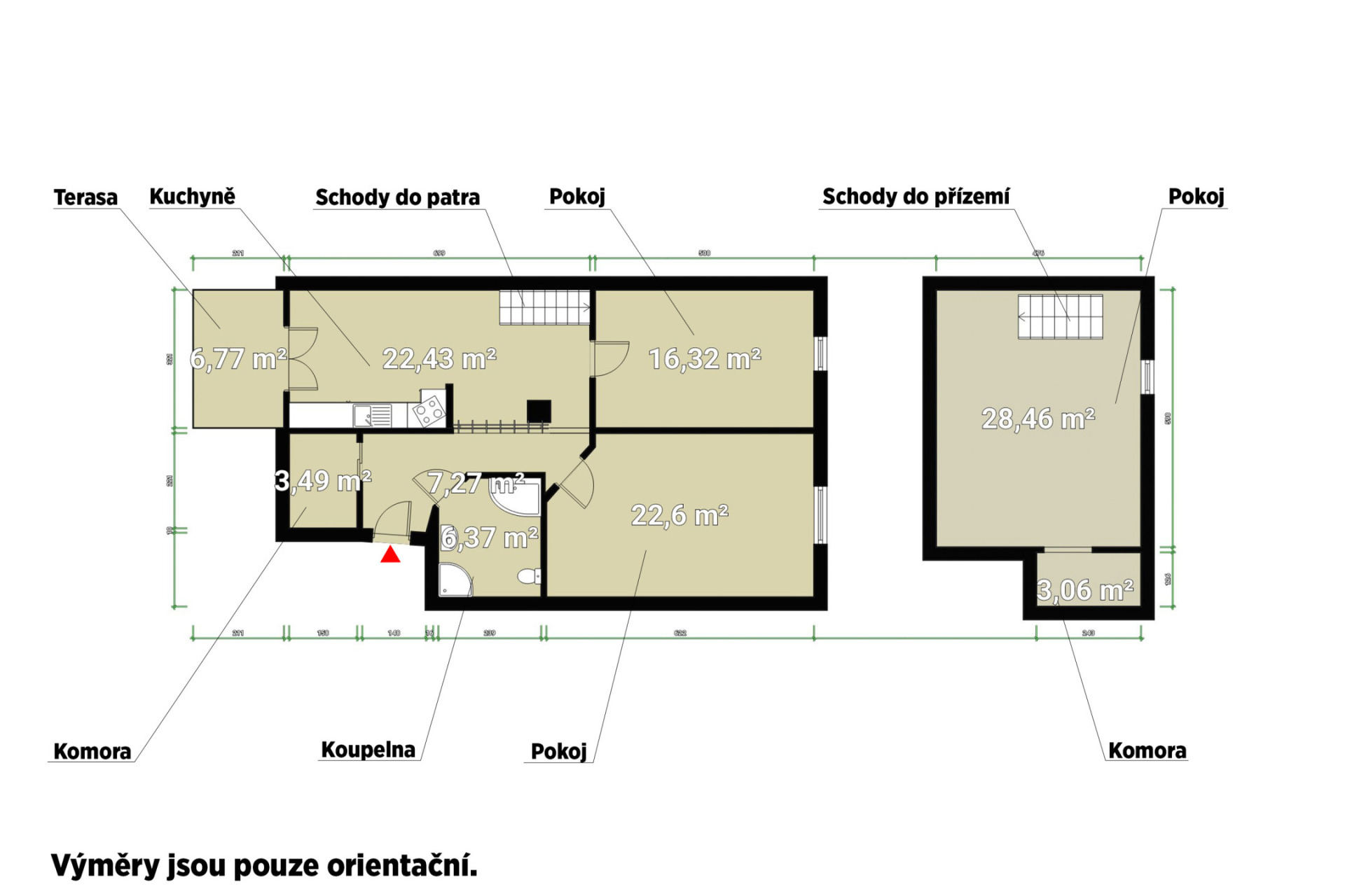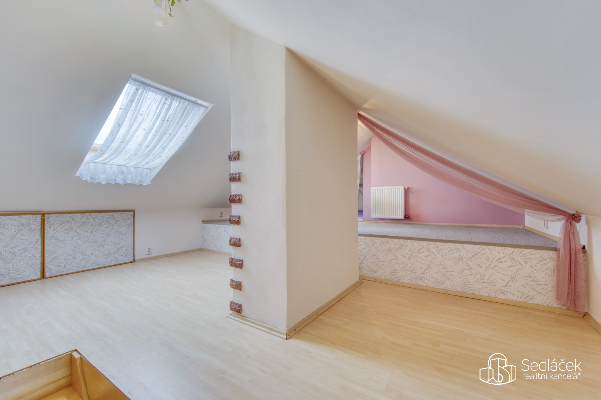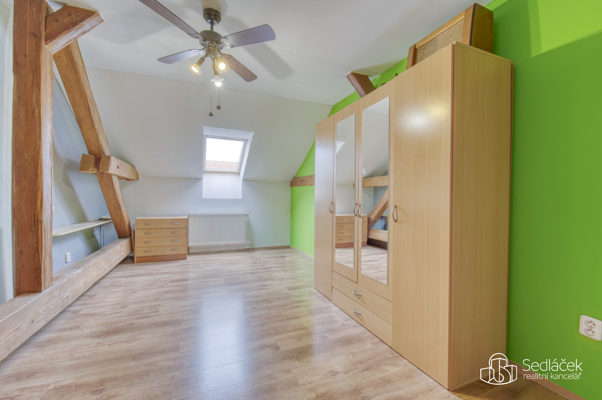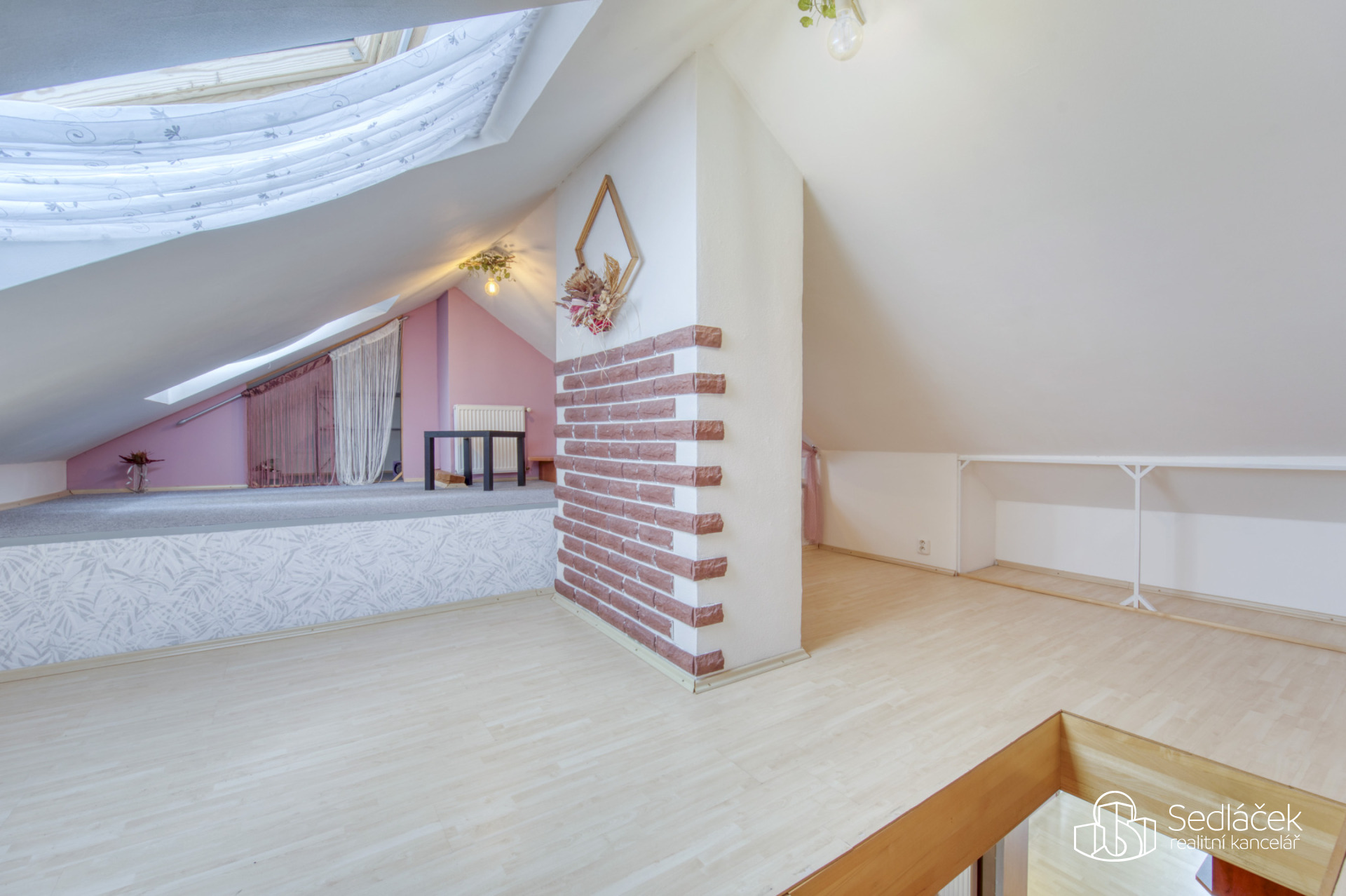 Dispozice bytu nabízí kuchyň s jídelním koutem, dva neprůchozí pokoje a nadstavbový prostor přístupný po dřevěných schodech, vhodný jako dětský kout, herna či spaní. Interiér podtrhuje kombinace pohledových trámů, korkových podlah a střešních i klasických oken, díky nimž má byt jedinečný charakter. Prostorná koupelna disponuje vanou i sprchovým koutem. Vytápění je řešeno kondenzačním plynovým kotlem.