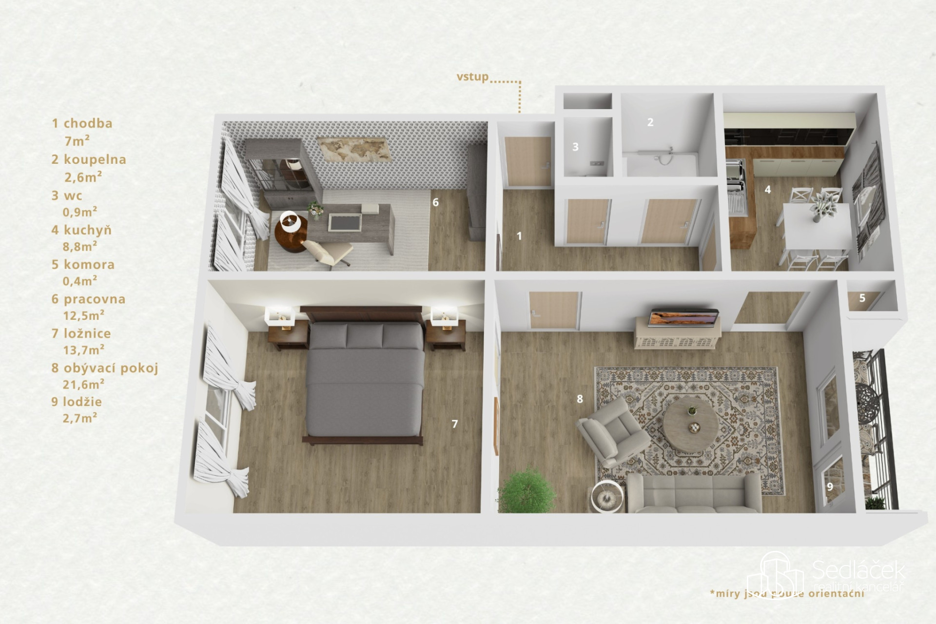 Dispozice bytu nabízí tři samostatné pokoje, a to dětský pokoj, ložnici a obývací pokoj se vstupem na balkon. Kuchyně je řešena jako samostatná místnost s dostatkem prostoru pro jídelní stůl. Na kuchyni navazuje praktická komora, která poskytuje další úložný prostor.
