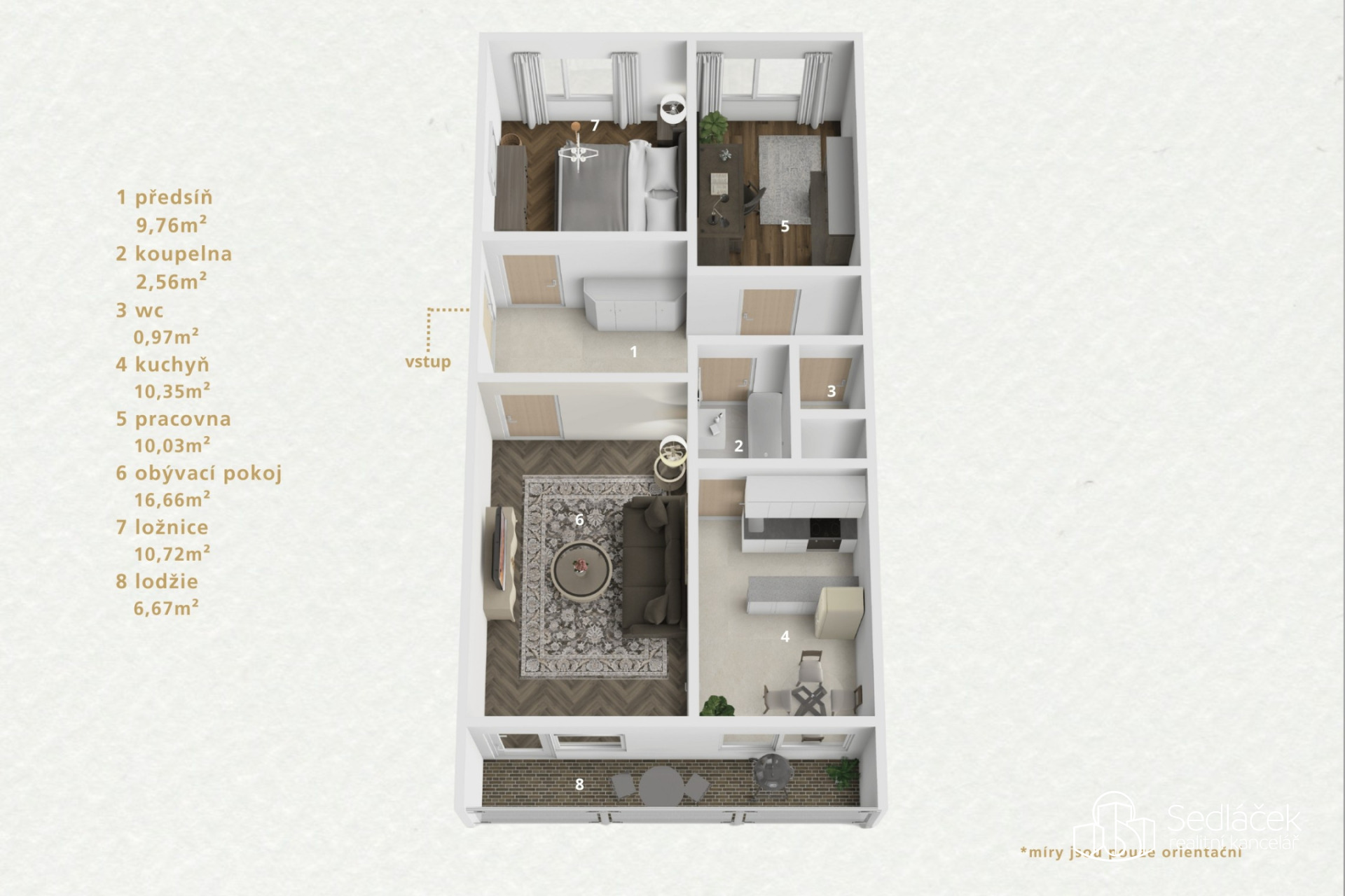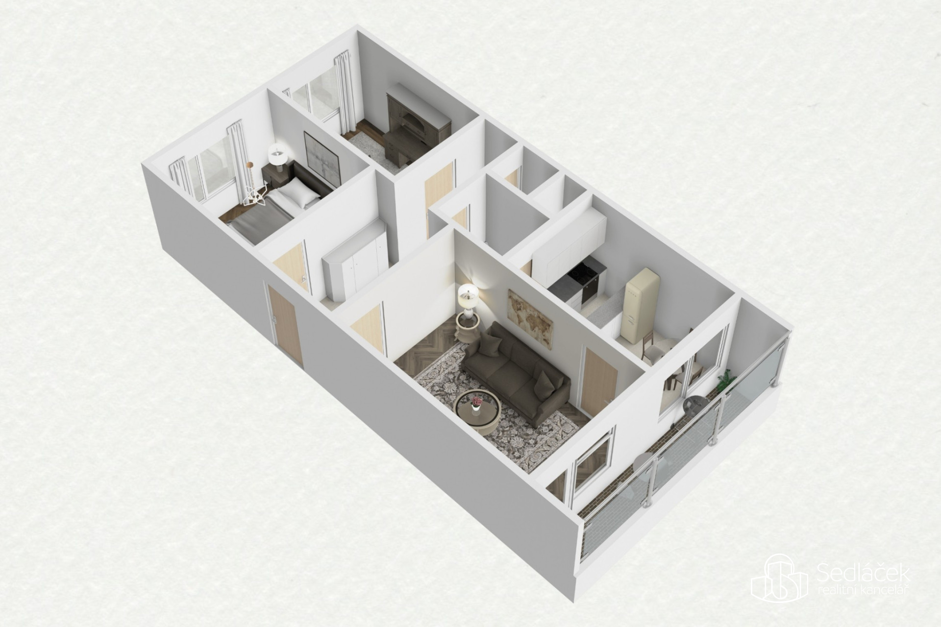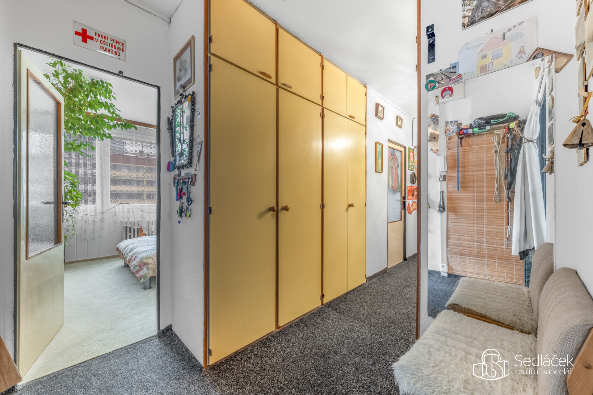 Dispozice bytu je praktická a funkční. Nabízí tři samostatné pokoje, včetně prostorného obývacího pokoje se vstupem na lodžii, která se táhne od obývacího pokoje až ke kuchyni. Kuchyně je řešena jako samostatná místnost s dostatkem prostoru pro každodenní provoz. Vstupní chodba s vestavnými skříněmi, koupelna s vanou a samostatné WC. K bytu náleží praktická komora umístěná přímo na patře, která nabízí další úložný prostor. Byt má nízké provozní náklady.