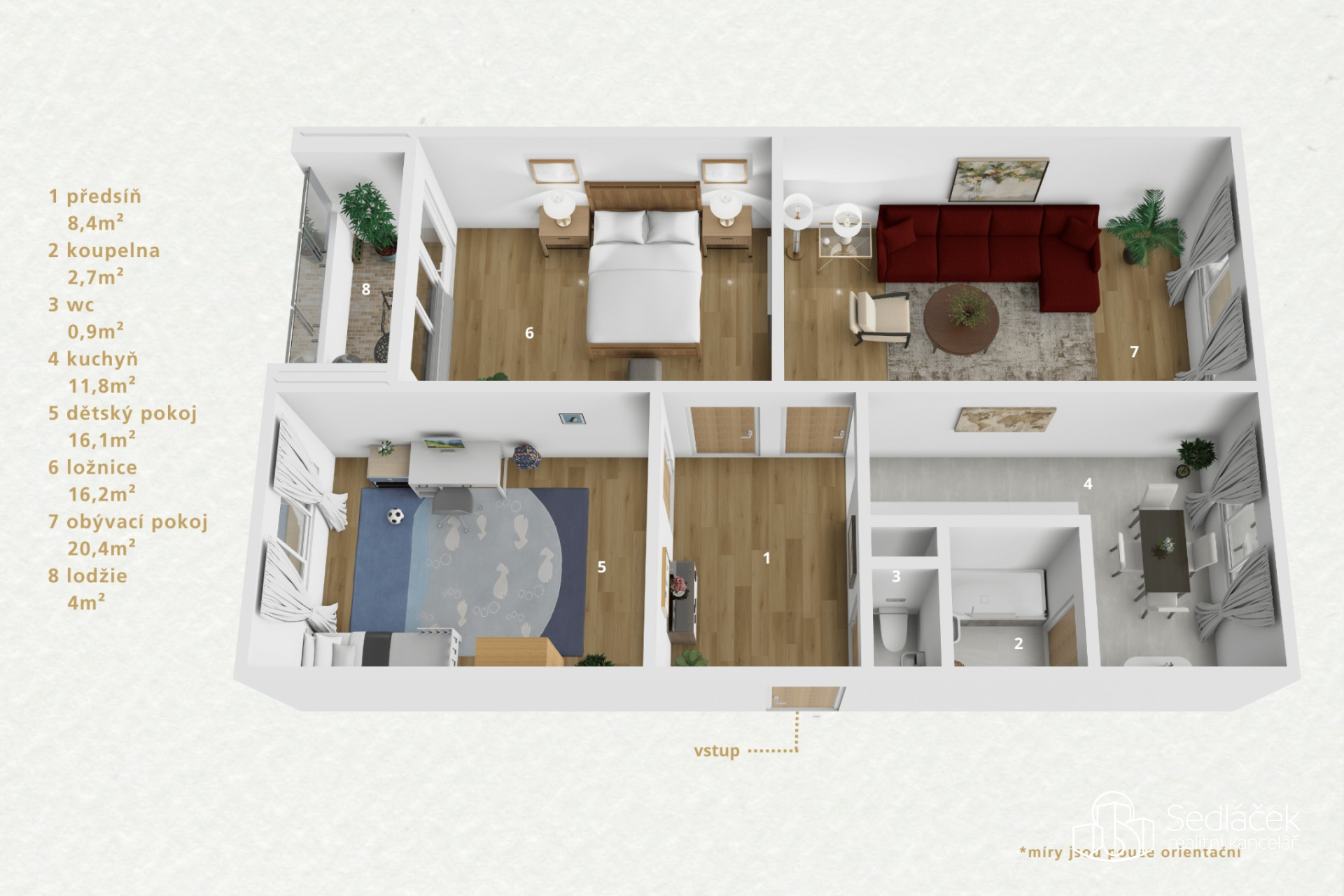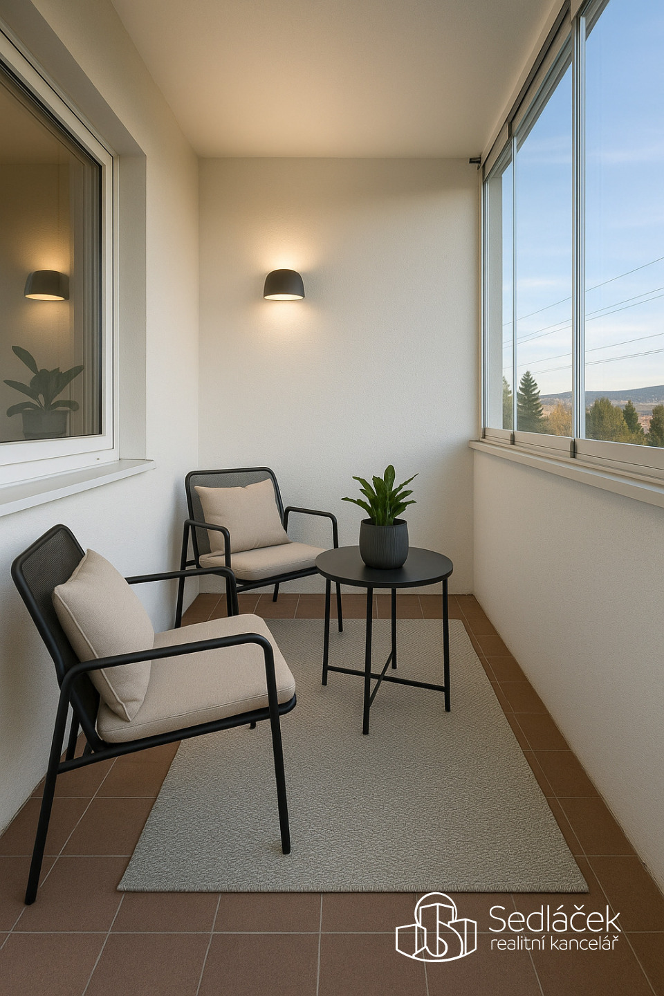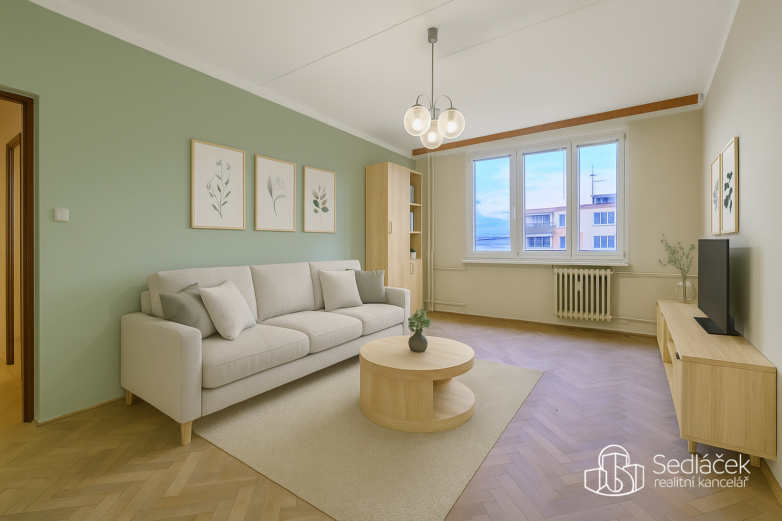 Dispozice bytu je praktická - prostorná vstupní chodba tvoří přirozené srdce bytu, odkud je vstup do všech místností. Kuchyň je samostatná, s dostatkem prostoru pro jídelní stůl. Obývací pokoj působí otevřeně a prosvětleně, ideální pro společné chvíle s rodinou. Dva samostatné pokoje poskytují klid a soukromí, z jednoho z nich je vstup na lodžii s příjemným výhledem. Koupelna je vybavena vanou, toaleta je samostatná a doplněná o umyvadlo.