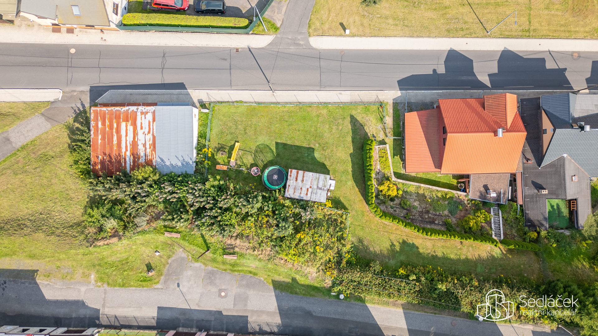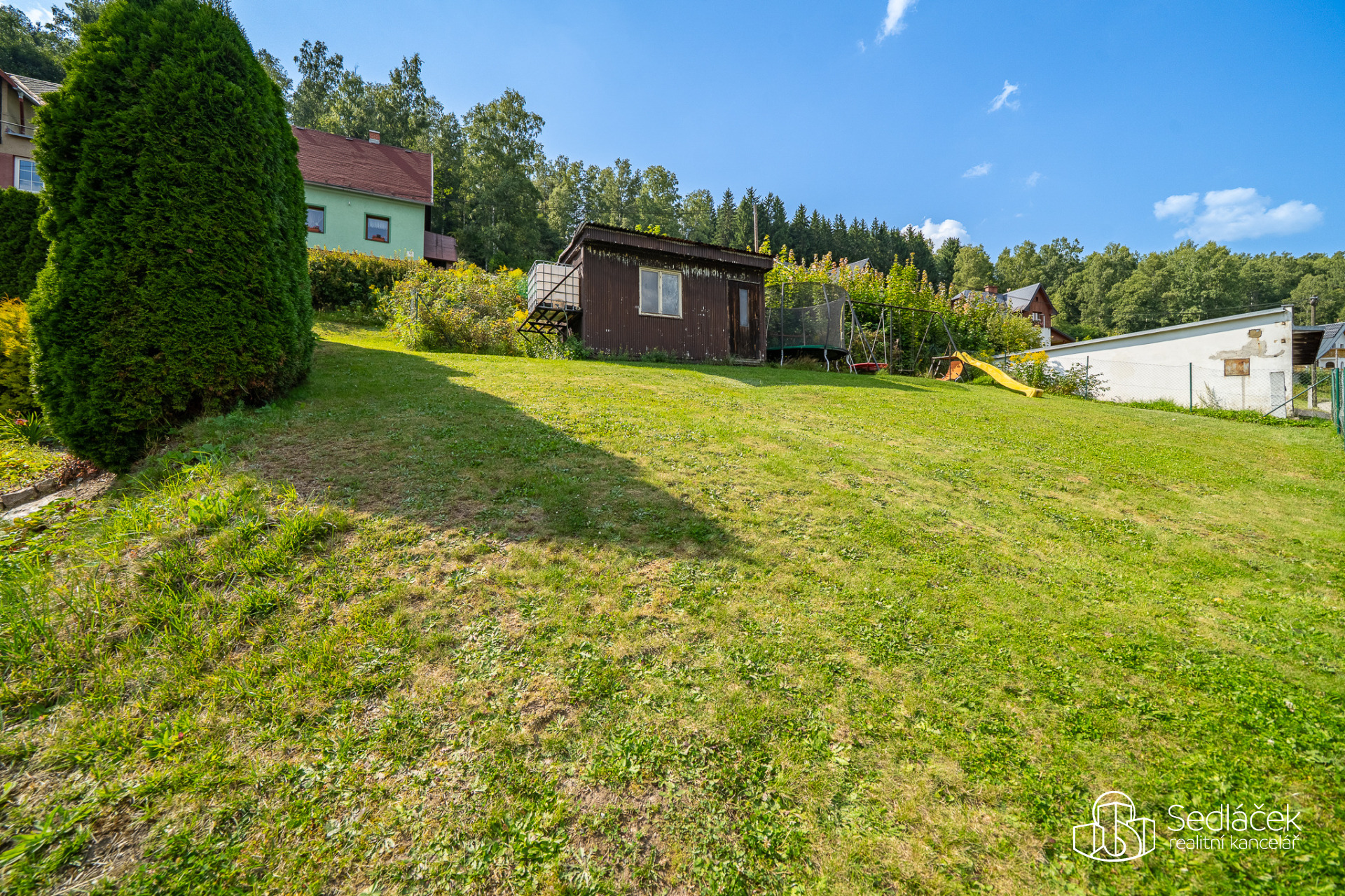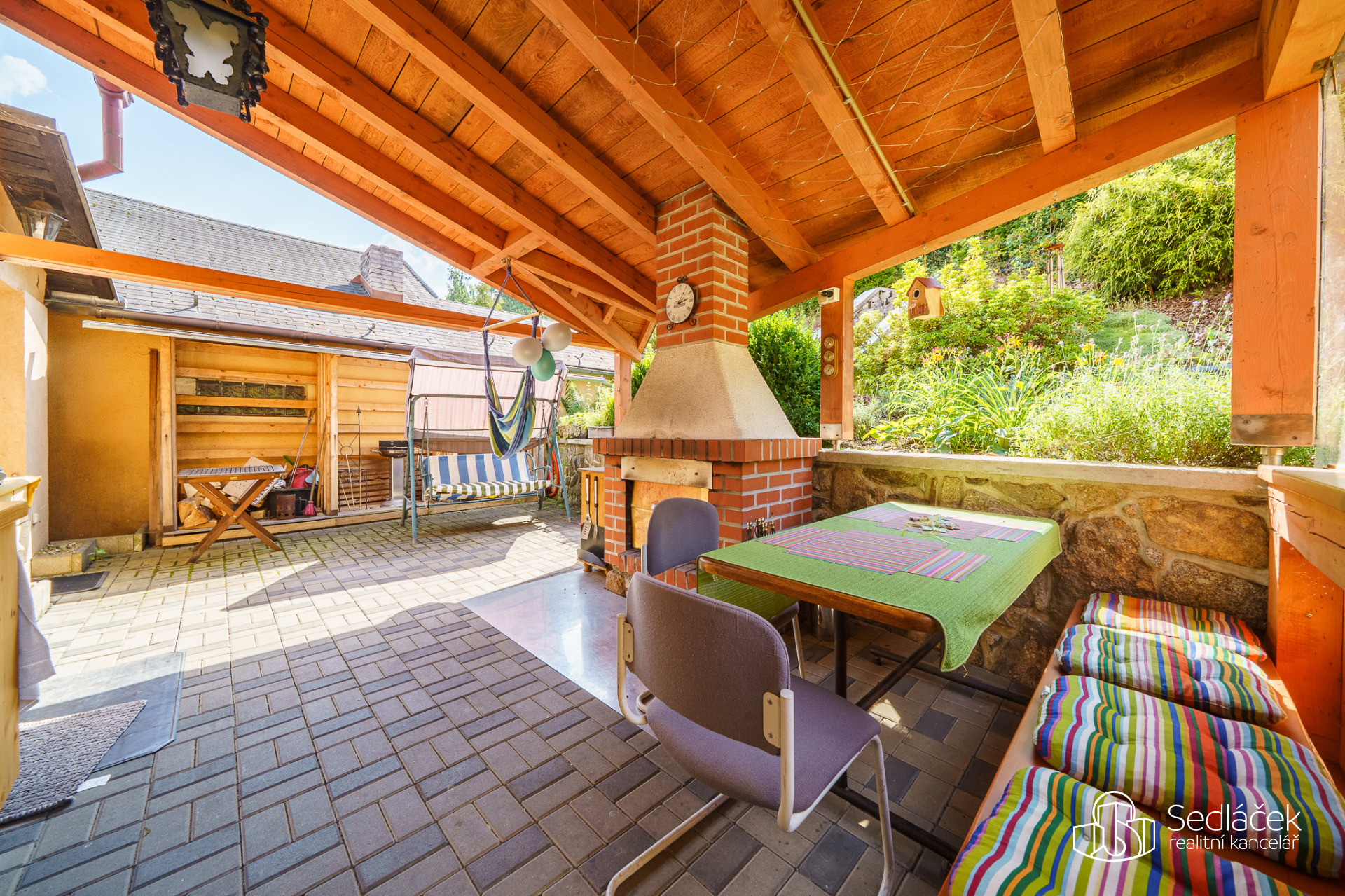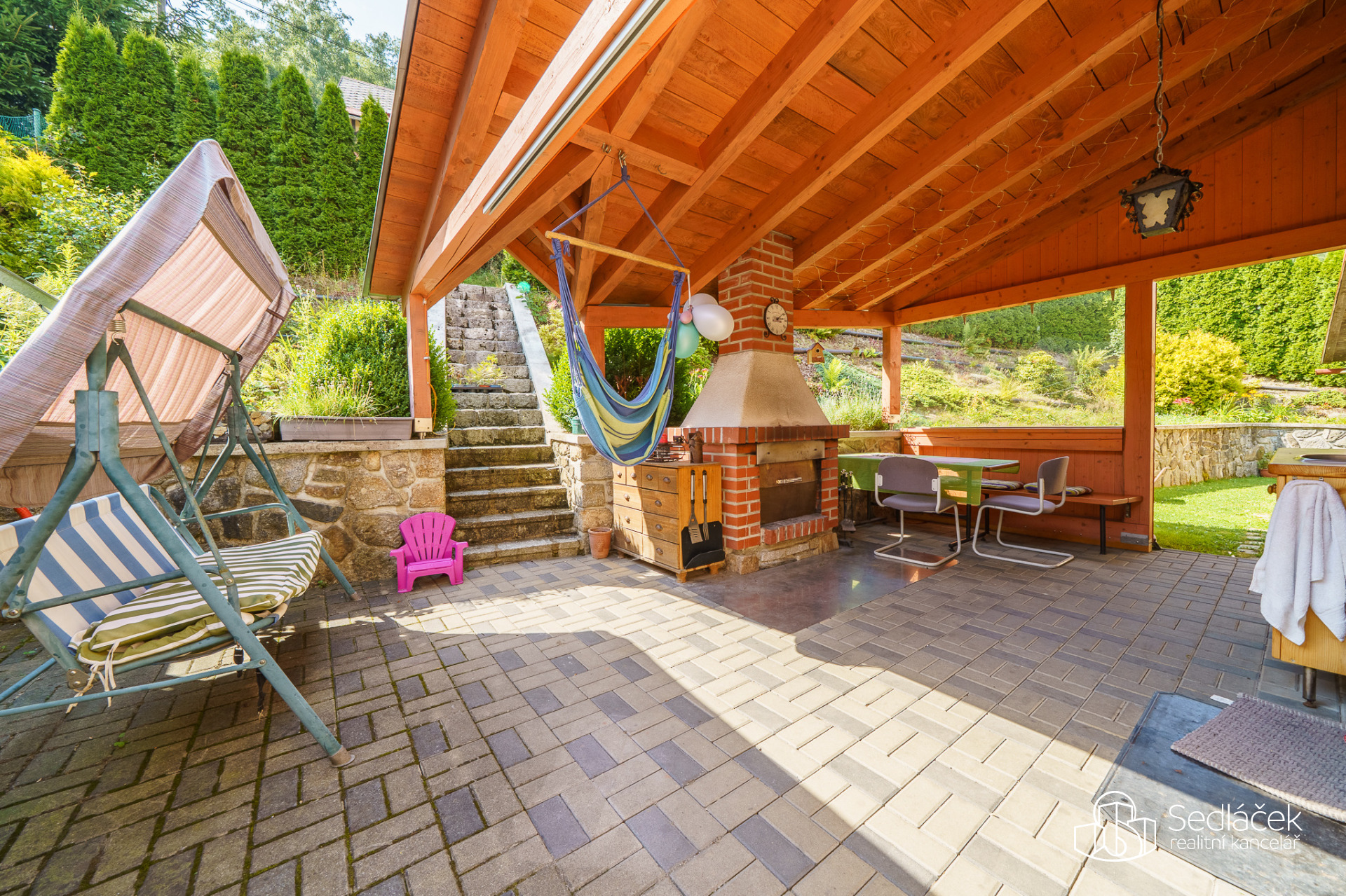 Zahrada je velmi udržovaná, najdete zde posezení s letní kuchyní, dětskou skluzavku i kůlnu na nářadí. Celkově je dům udržovaný a připravený k okamžitému bydlení.