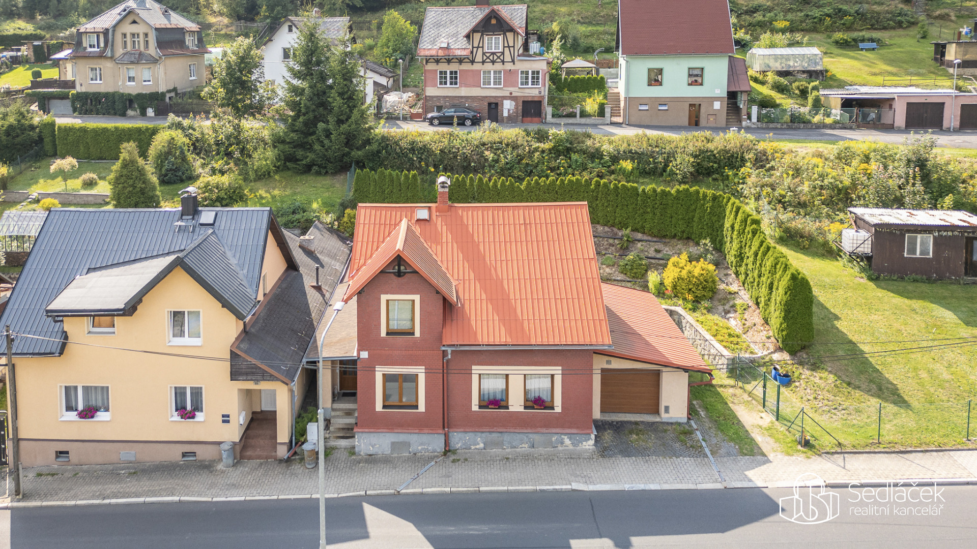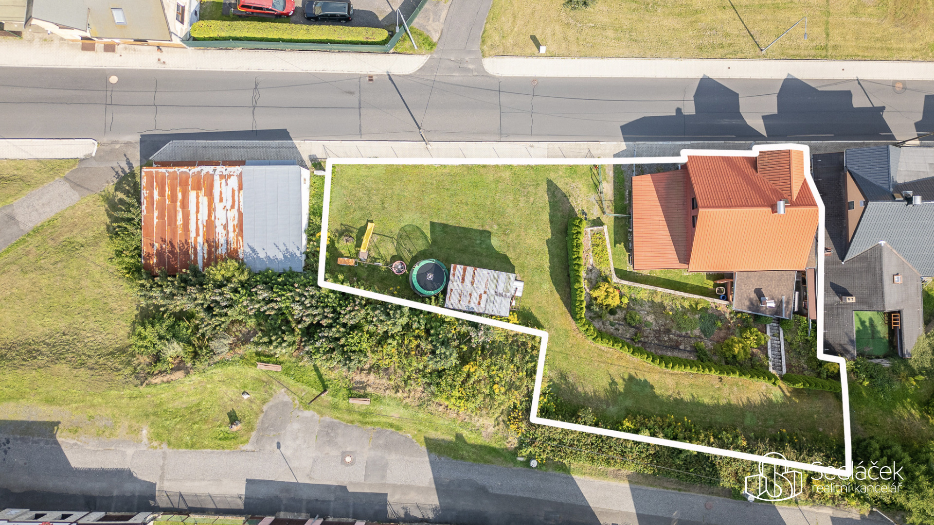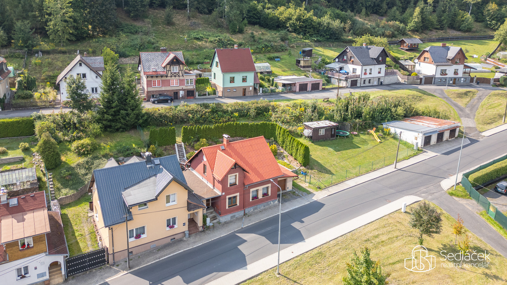 Zahrada je velmi udržovaná, najdete zde posezení s letní kuchyní, dětskou skluzavku i kůlnu na nářadí. Celkově je dům udržovaný a připravený k okamžitému bydlení.