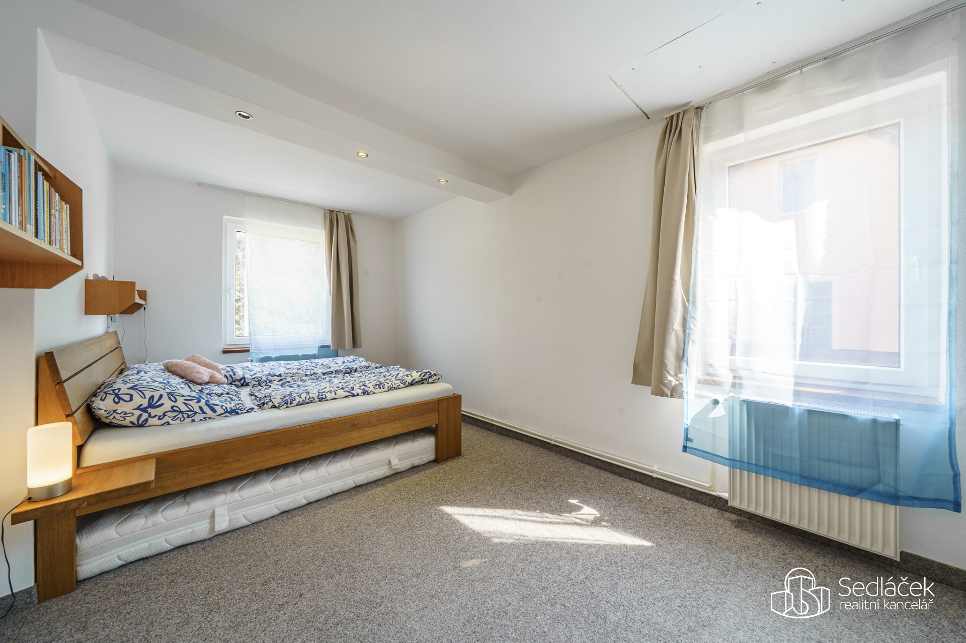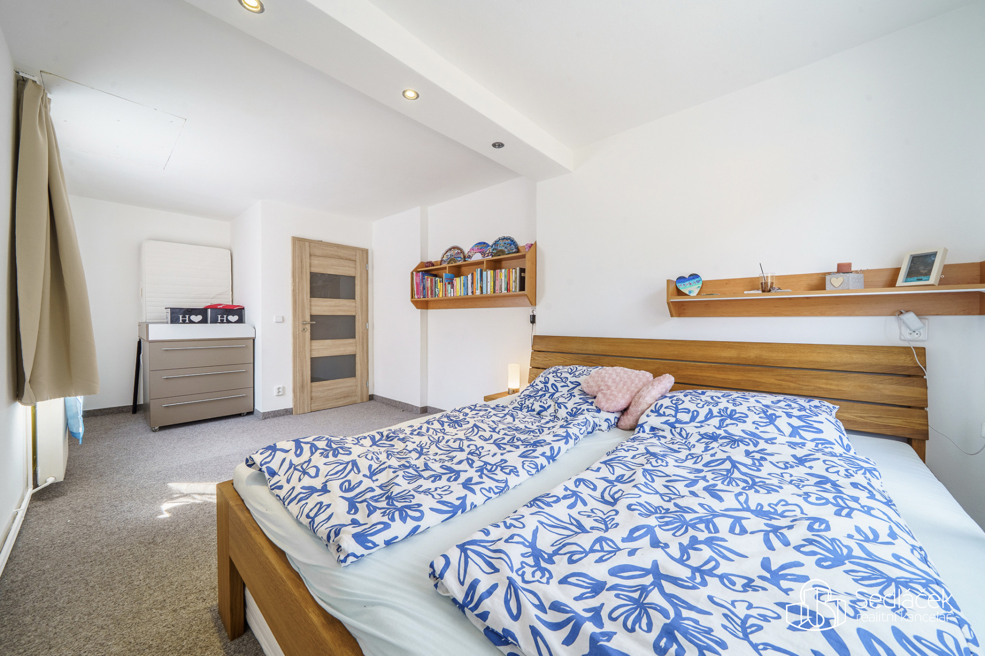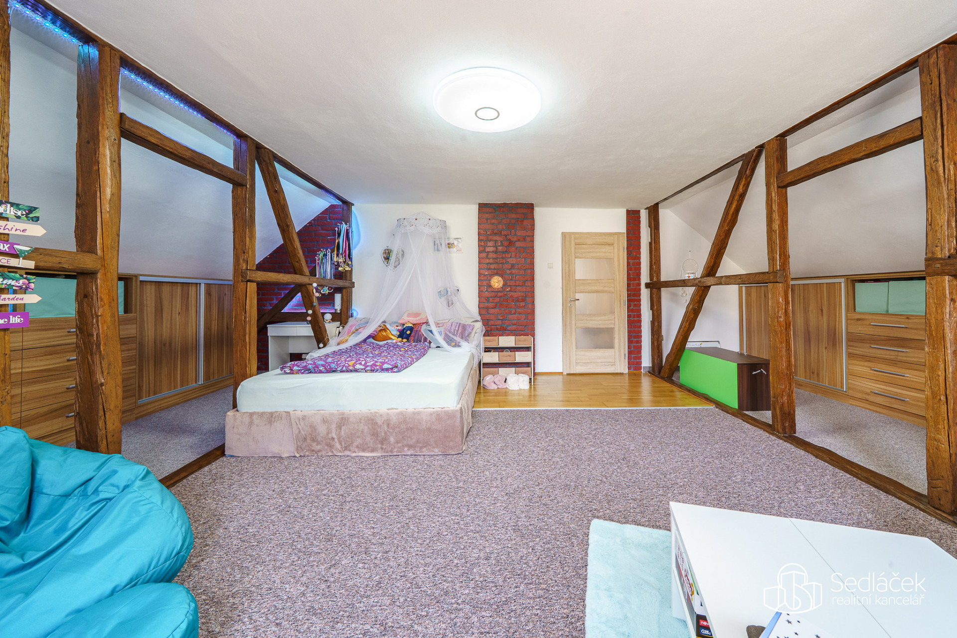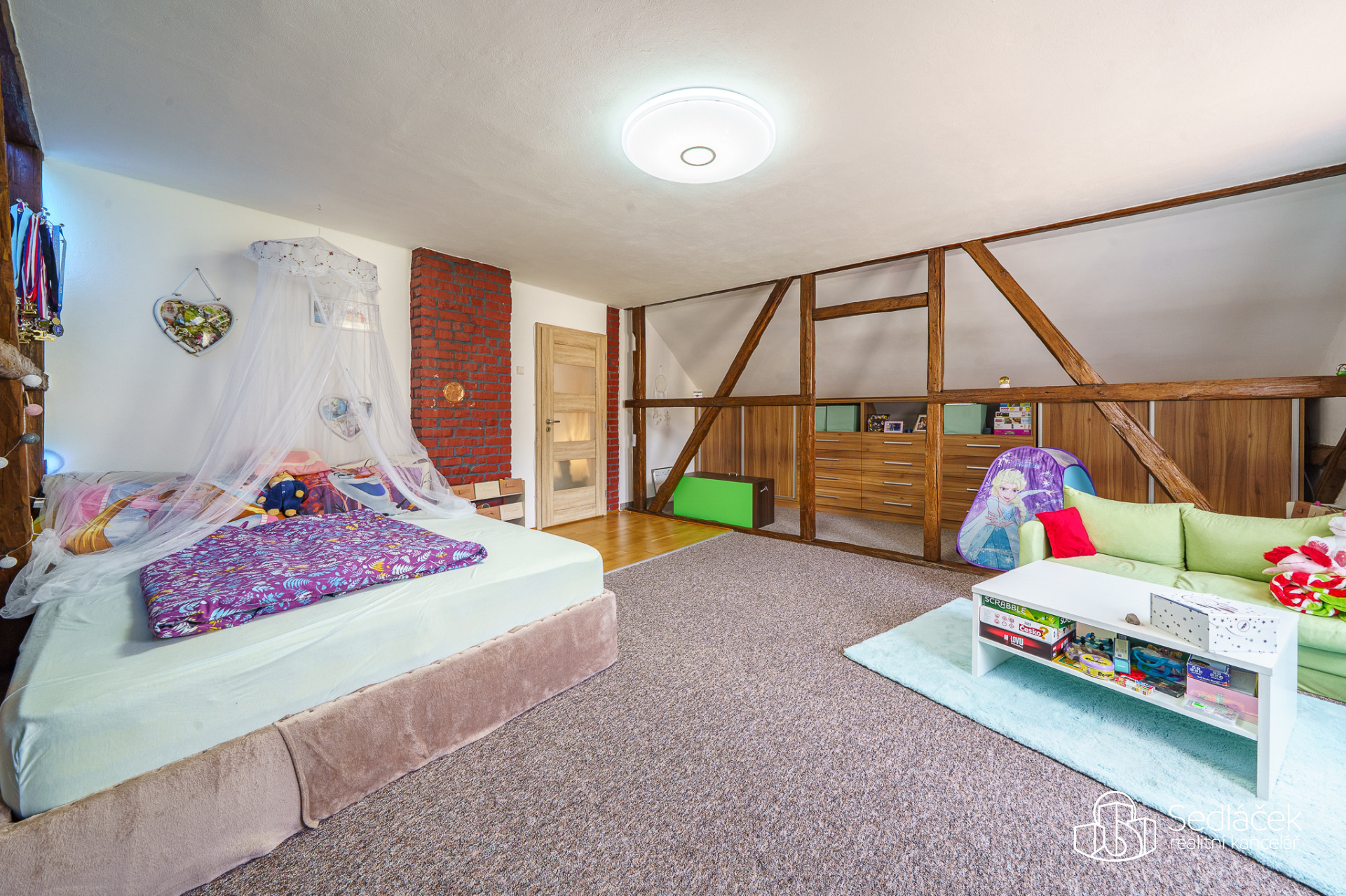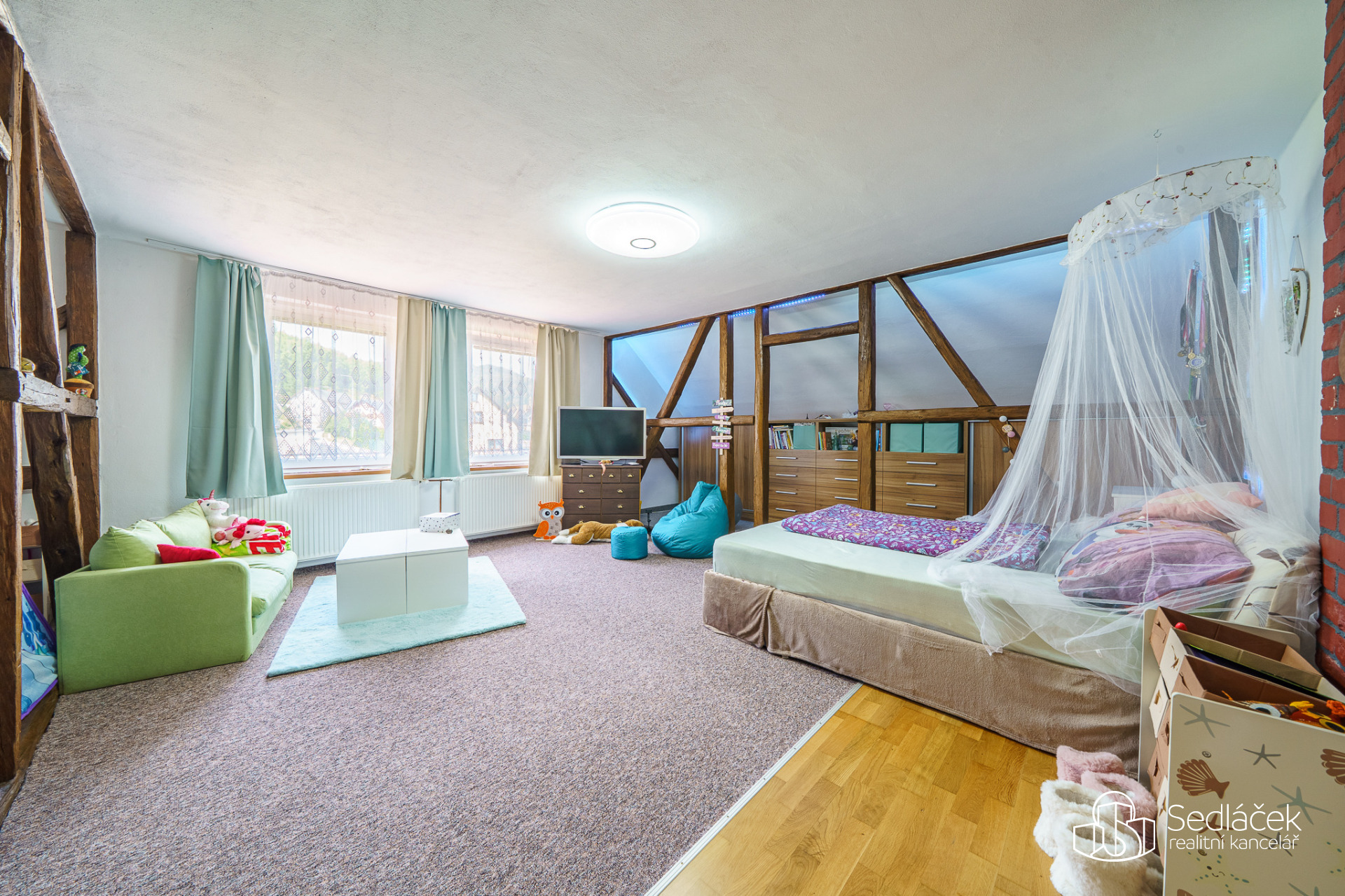 V patře najdeme dvě samostatné ložnice. Dětský pokoj je nadstandartně velký. Půda je další možností úložného prostoru. Schodiště je kamenné, elektroinstalace v mědi. Vytápění zajišťuje plynový kondenzační kotel se zásobníkem na vodu o objemu 75 litrů, jeho stáří je přibližně 10 let. Střecha byla provedena kolem roku 2004 s krytinou z al šablon. Dům je napojen na veřejnou kanalizaci.