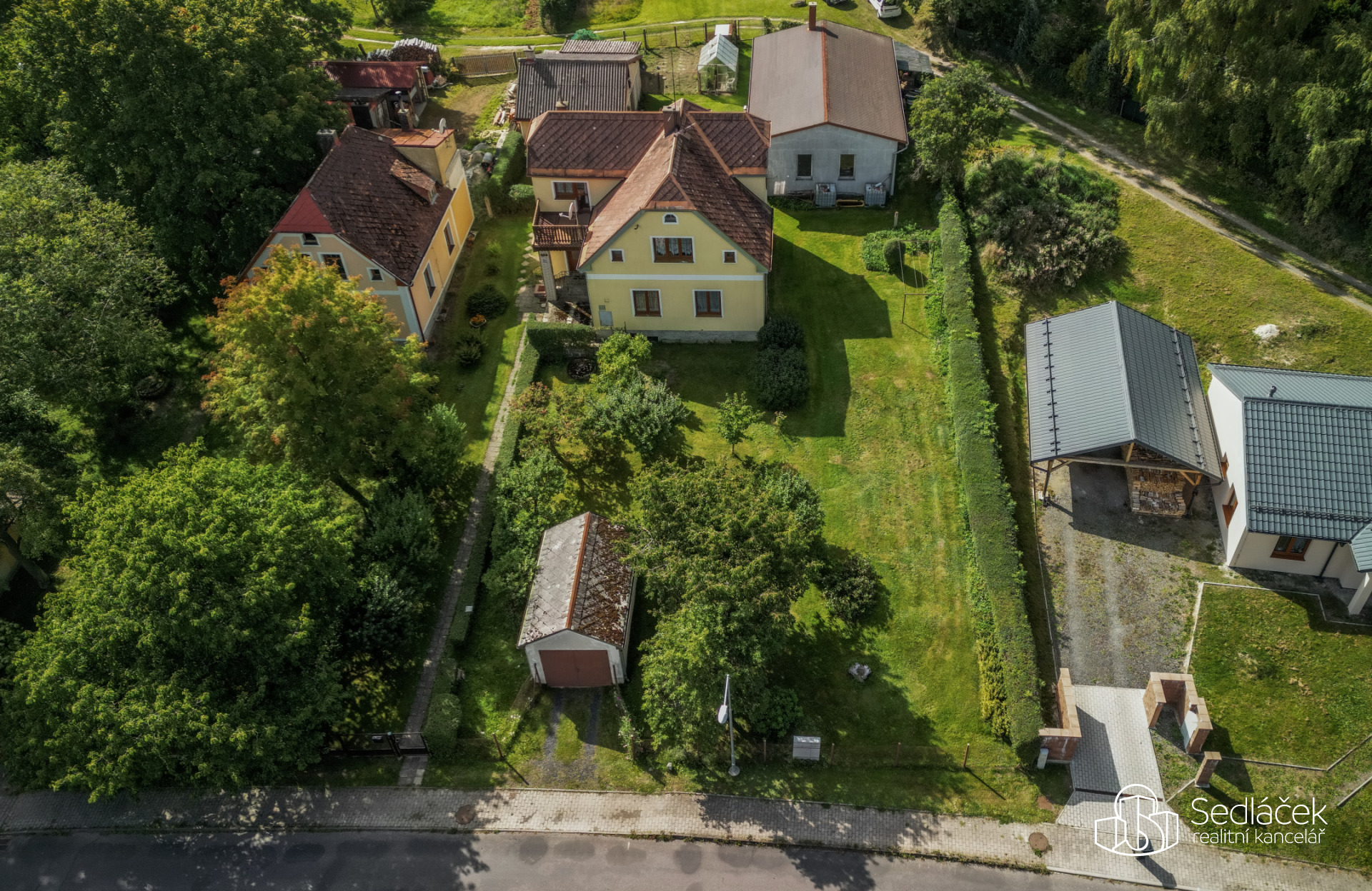 Dům stojí na slunném pozemku o velikosti 1 022 m² se vzrostlými stromy, keři a příjemným koutem pro posezení.