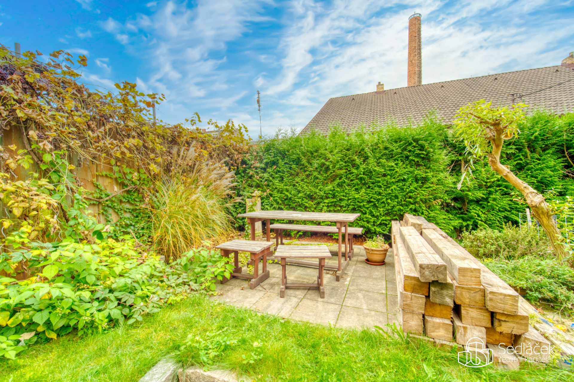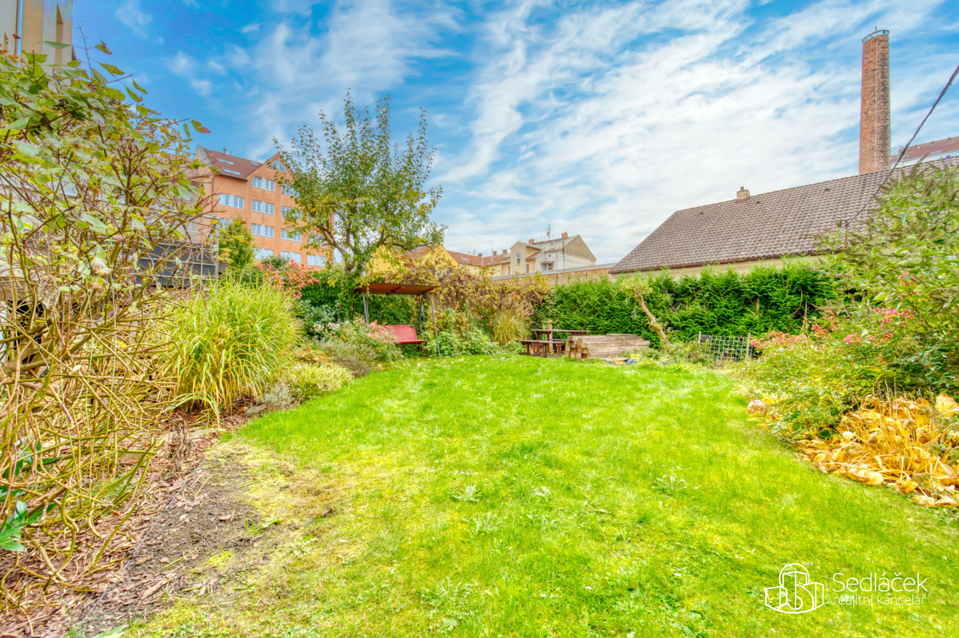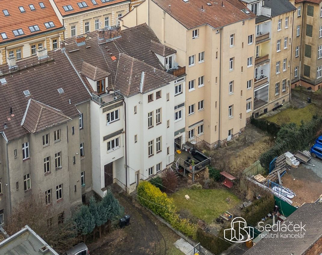 Velkou výhodou domu je společný dvorek, ideální pro posezení nebo klidné odpoledne. Dalším benefitem je docházková vzdálenost do centra Plzně – při svižné chůzi jste tam zhruba za deset minut.