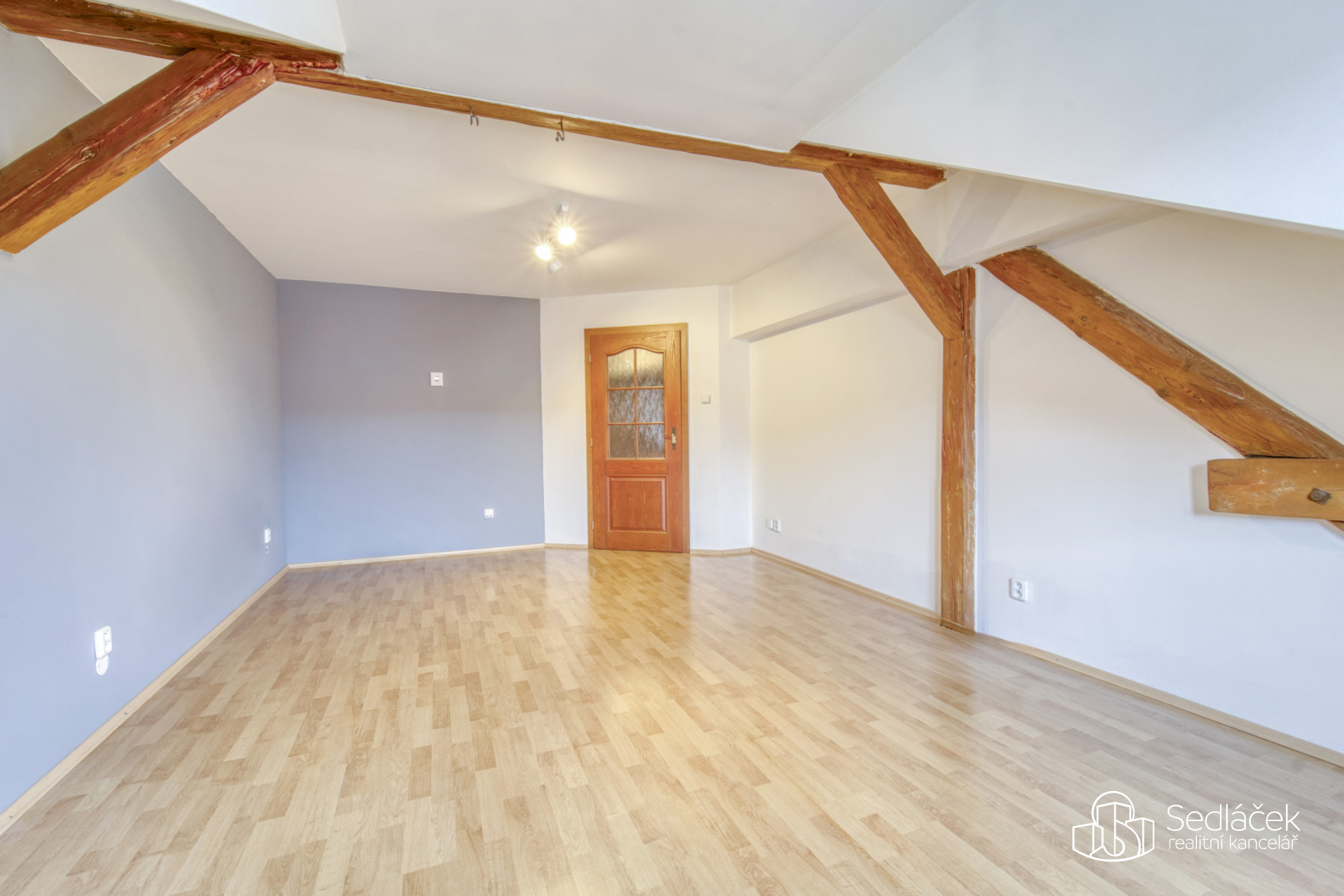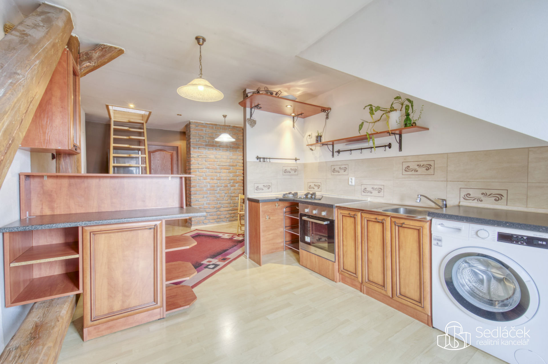 Dispozice bytu nabízí kuchyň s jídelním koutem, dva neprůchozí pokoje a nadstavbový prostor přístupný po dřevěných schodech, vhodný jako dětský kout, herna či spaní. Interiér podtrhuje kombinace pohledových trámů, korkových podlah a střešních i klasických oken, díky nimž má byt jedinečný charakter. Prostorná koupelna disponuje vanou i sprchovým koutem. Vytápění je řešeno kondenzačním plynovým kotlem.