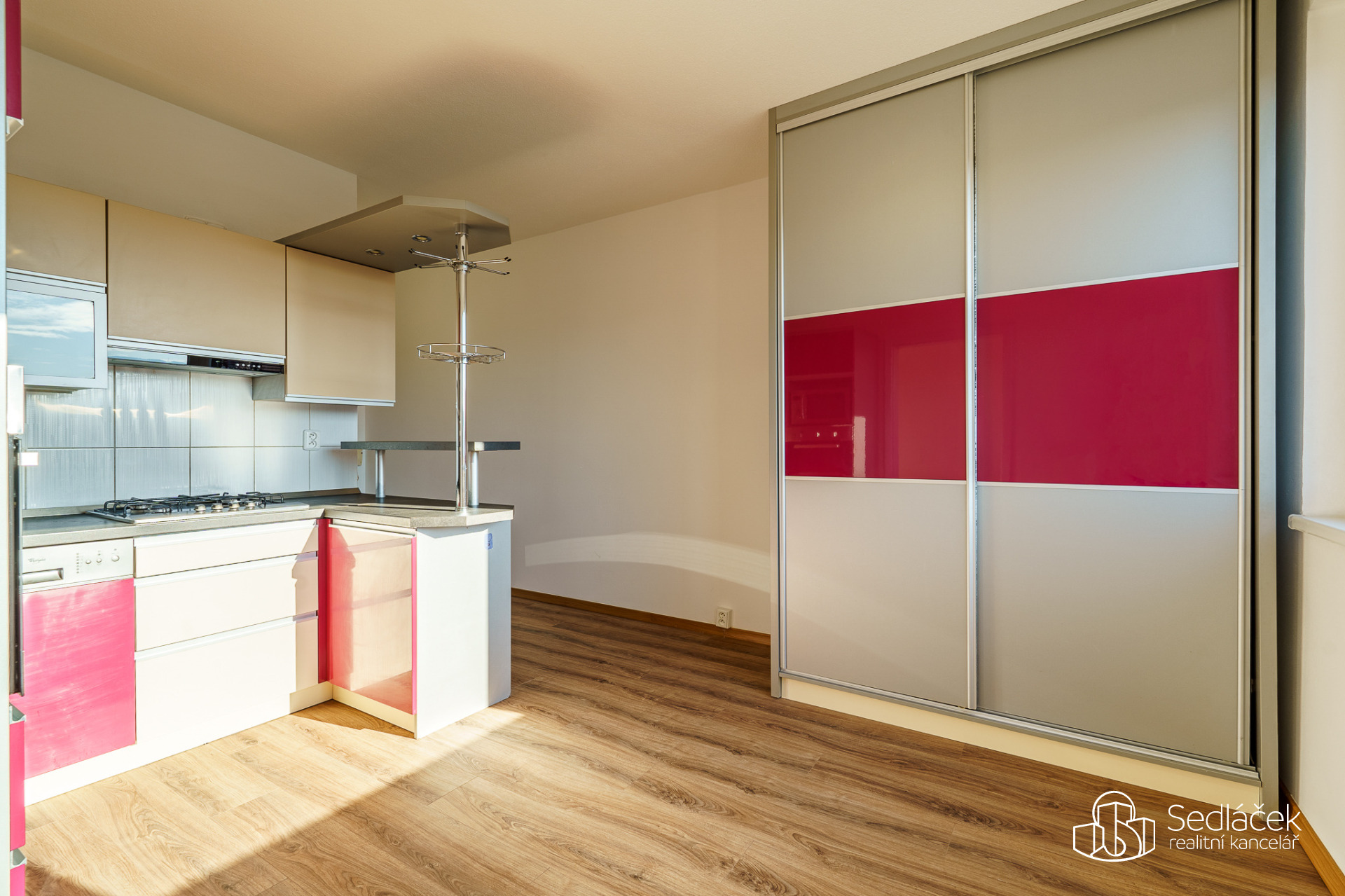 Interiér bytu je navržen s citem pro detail a pohodlí. Velkým přínosem je moderně řešená kuchyň, která je vybavena kvalitní kuchyňskou linkou včetně všech potřebných spotřebičů -sporák, digestoř, trouba a myčka nádobí. Kuchyň harmonicky ladí s prostornou skříní na míru, která poskytuje dostatek úložného prostoru a zároveň dotváří elegantní celkový vzhled.