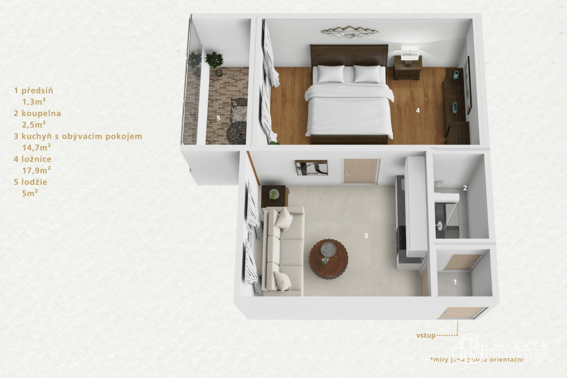 Dispozice bytu tvoří samostatná kuchyň, pokoj a koupelna s WC.