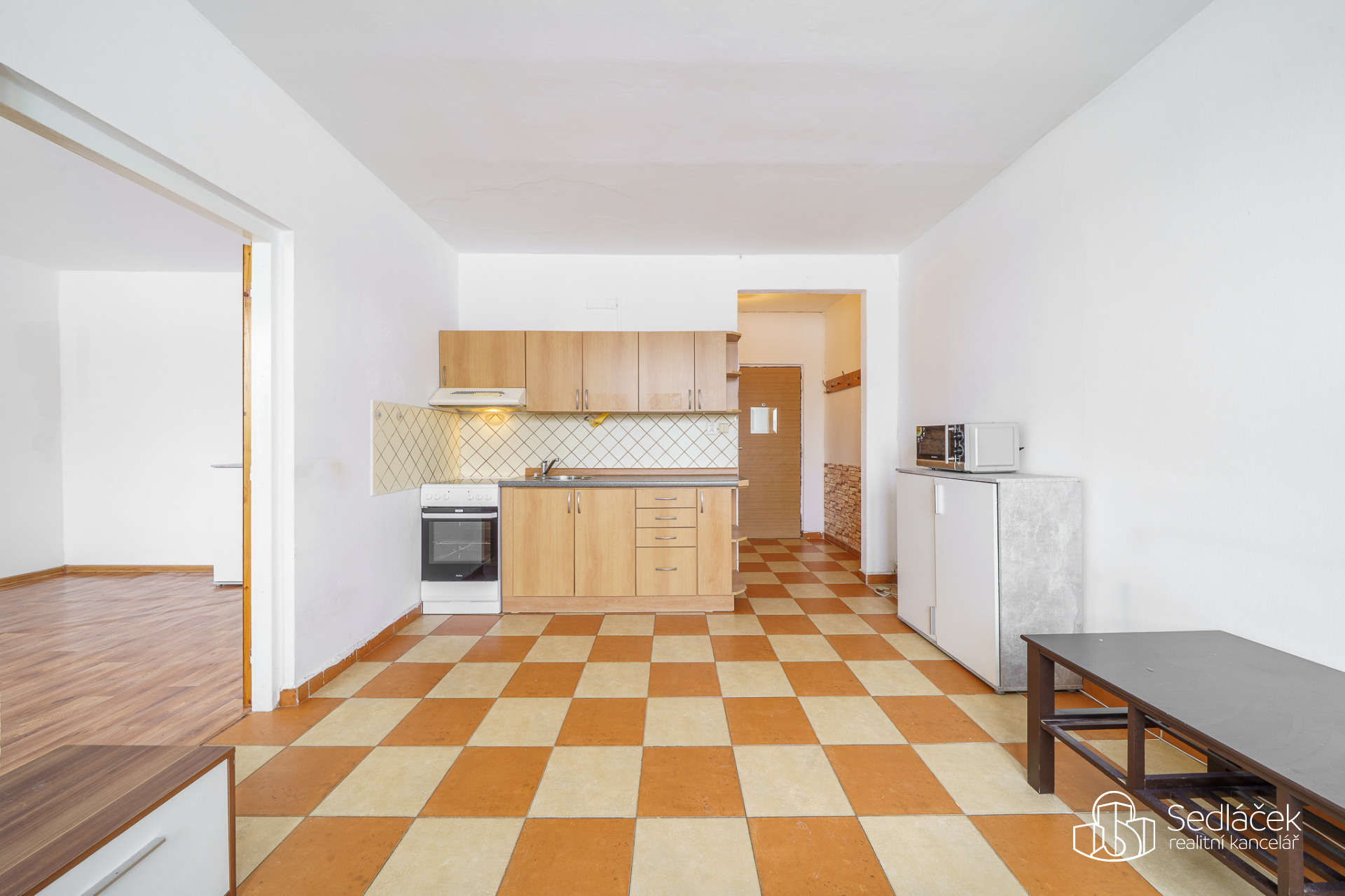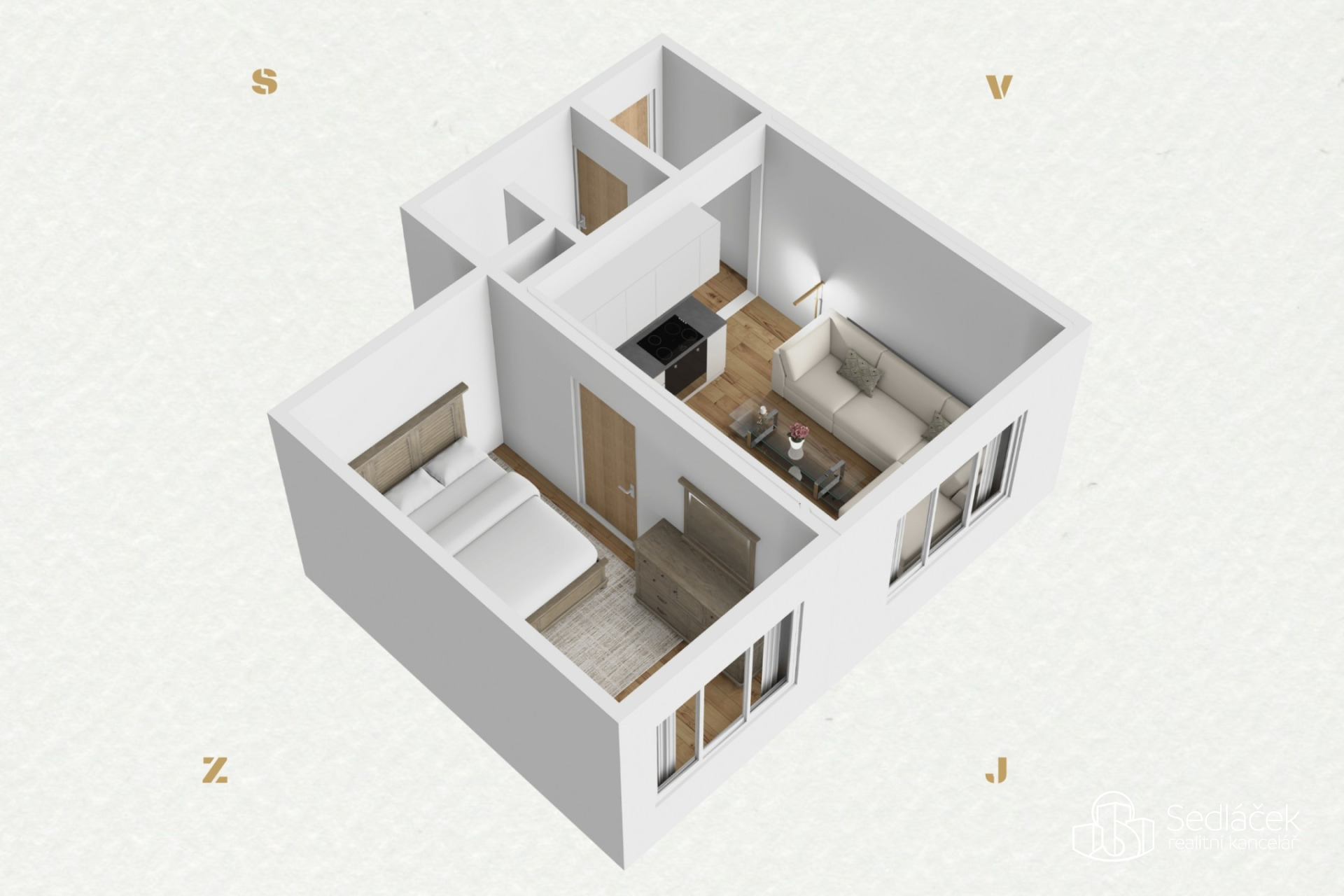 Dispozice bytu je praktická a funkční. Kuchyně je propojena s obývacím prostorem, k dispozici je samostatná ložnice a koupelna s vanou a toaletou. Plastová okna zajišťují tepelnou i zvukovou izolaci. K bytu náleží dvě sklepní kóje, které poskytují dostatek úložného prostoru.