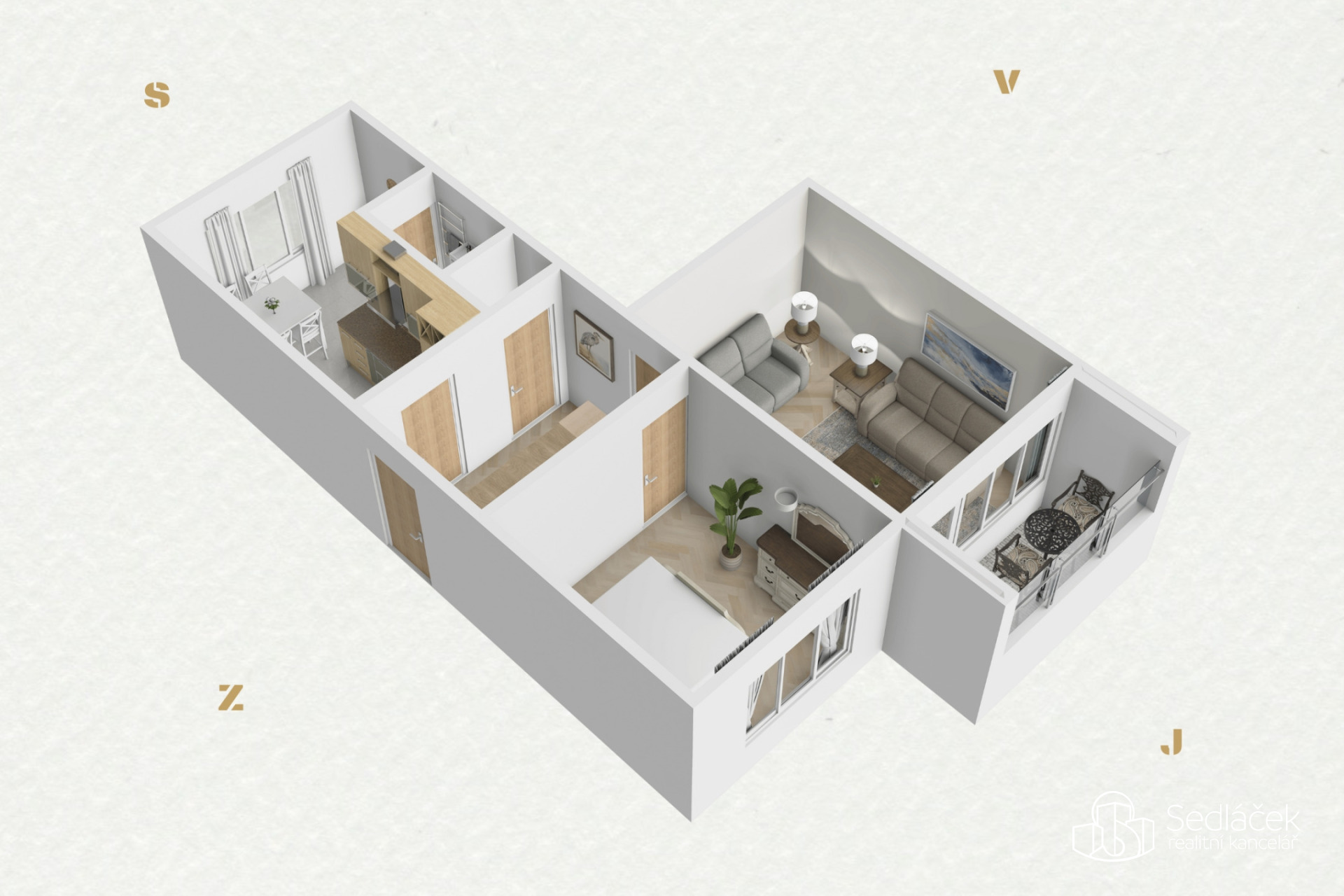Jednotka je v původním, avšak velmi dobře udržovaném stavu. Dispozice zahrnuje kuchyň, obývací pokoj, ložnici, koupelnu, samostatné WC a předsíň s vestavěným úložným prostorem. Okna jsou plastová. Podlaha v kuchyni a v předsíni byla zrenovována. Součástí je také zasklená lodžie a sklepní kóje v mezipatře.