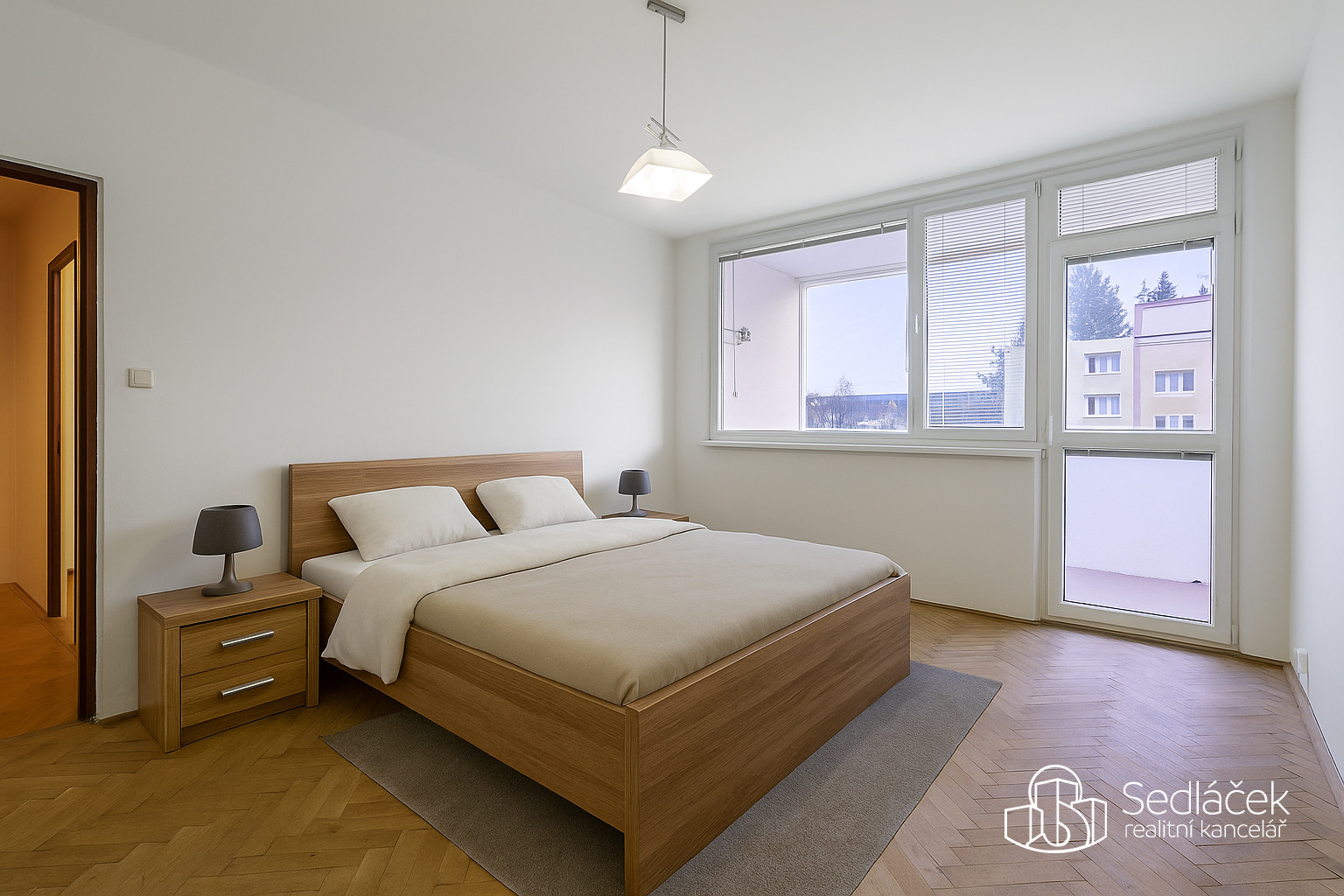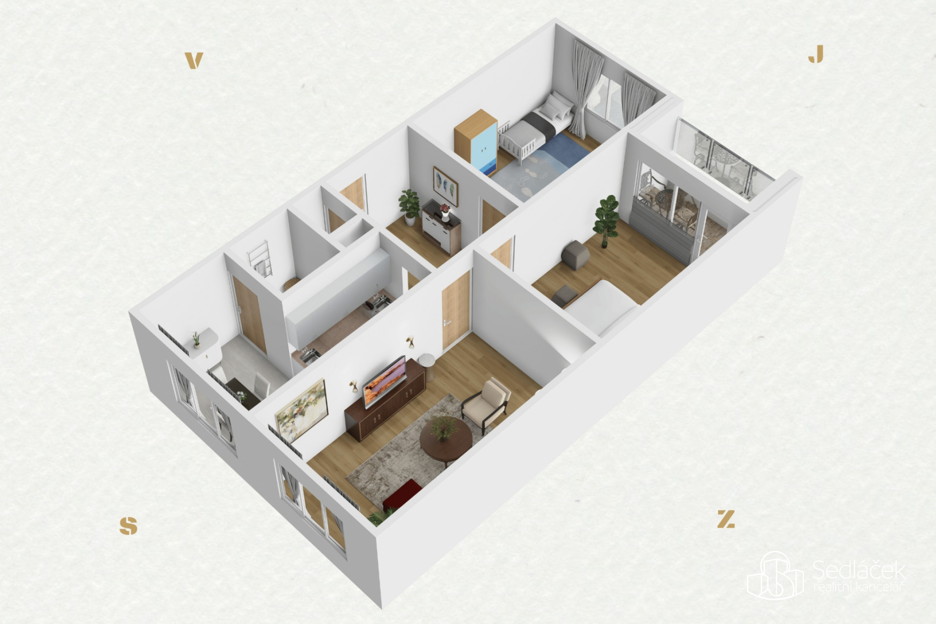Dispozice bytu je praktická - prostorná vstupní chodba tvoří přirozené srdce bytu, odkud je vstup do všech místností. Kuchyň je samostatná, s dostatkem prostoru pro jídelní stůl. Obývací pokoj působí otevřeně a prosvětleně, ideální pro společné chvíle s rodinou. Dva samostatné pokoje poskytují klid a soukromí, z jednoho z nich je vstup na lodžii s příjemným výhledem. Koupelna je vybavena vanou, toaleta je samostatná a doplněná o umyvadlo.