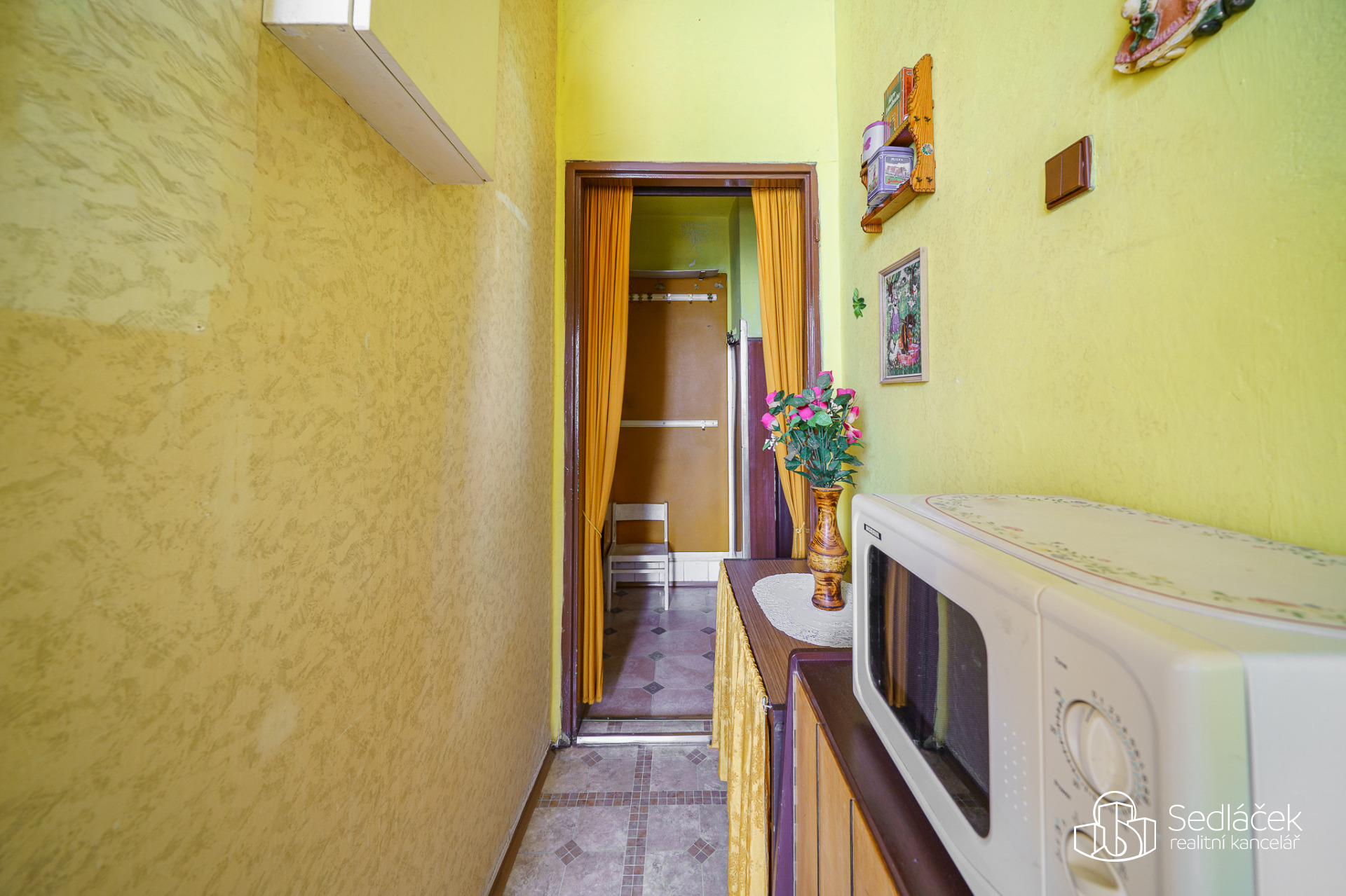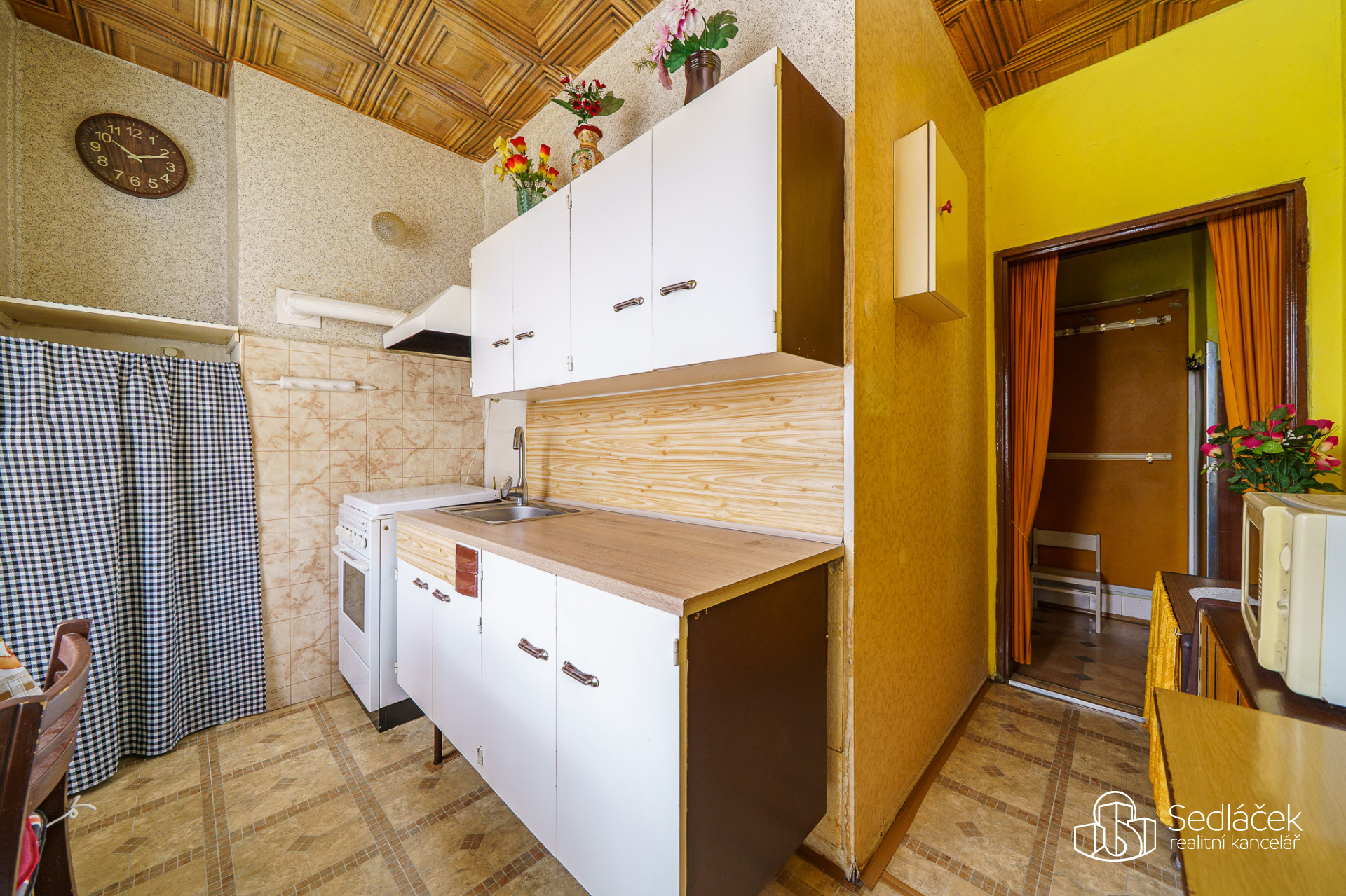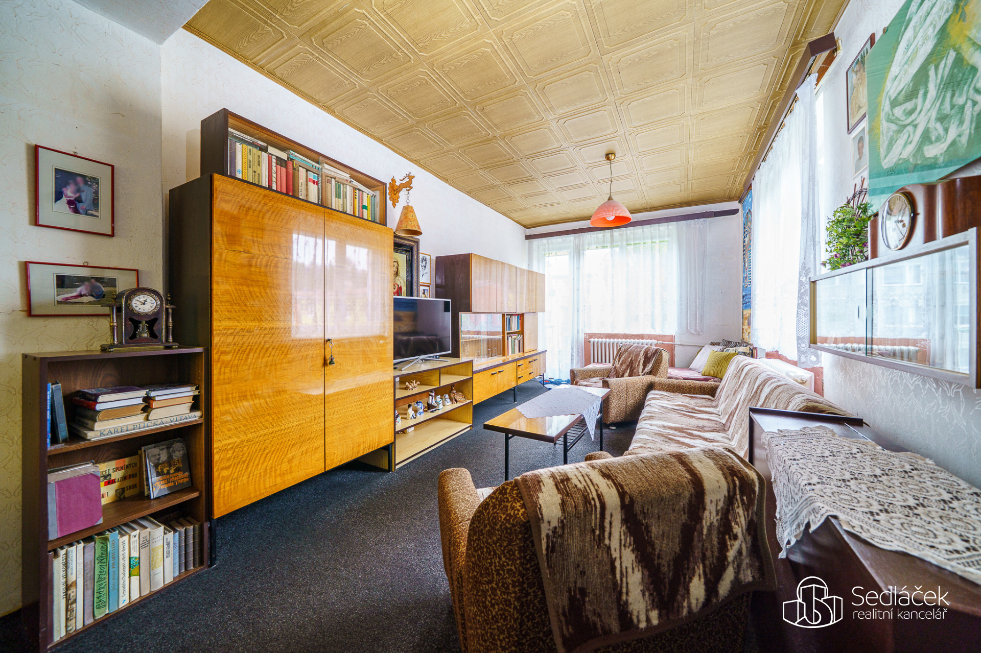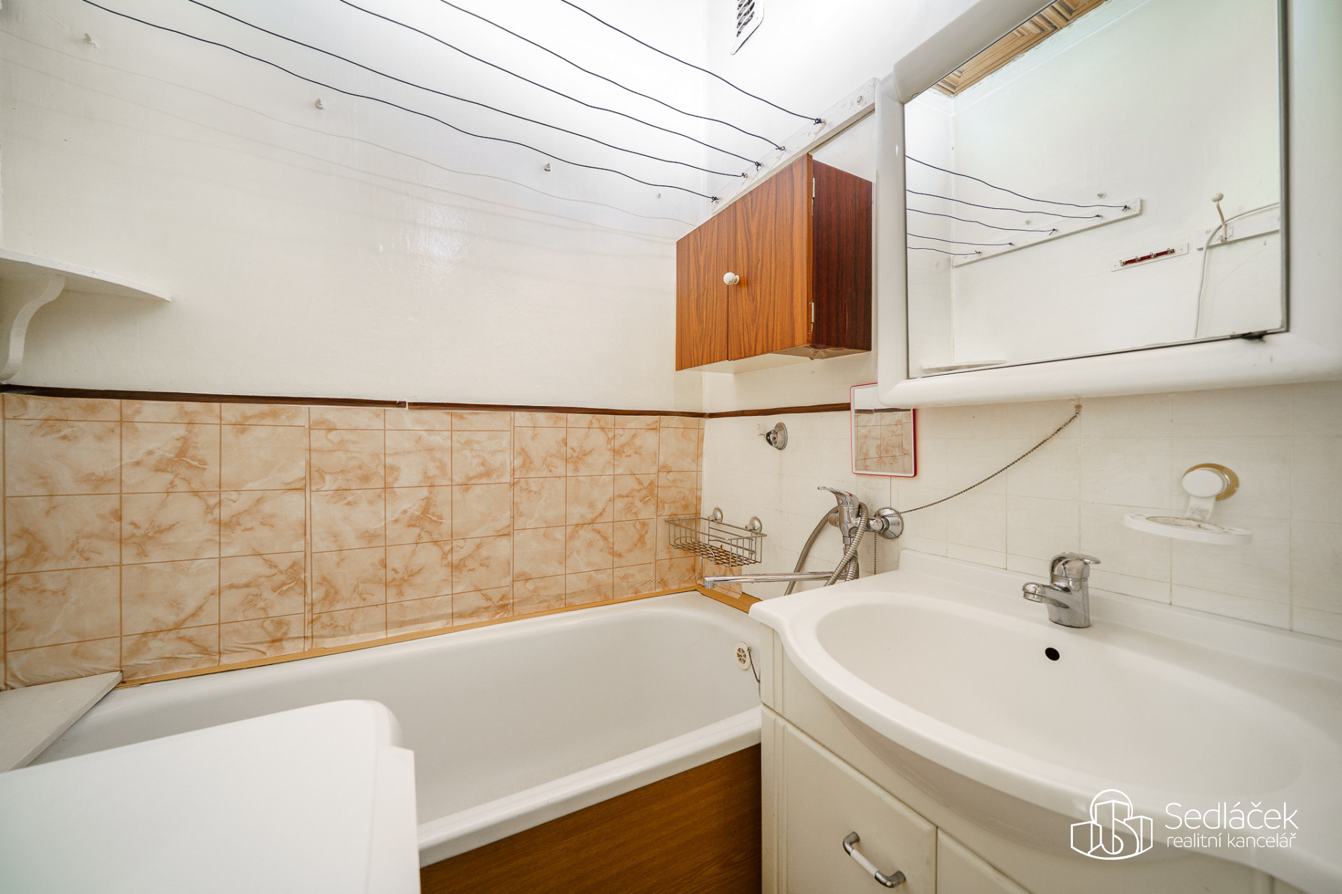 Dispozice: předsíň s vestavěnými skříněmi, samostatné WC, koupelna s vanou, kuchyň s plynovým sporákem a zachovalou linkou, obývací pokoj s balkonem a výhledem do dvou světových stran a ložnice. Jádro je zděné, okna plastová.