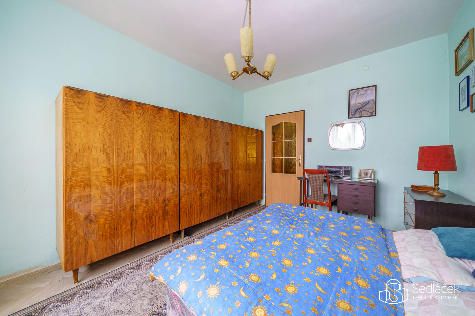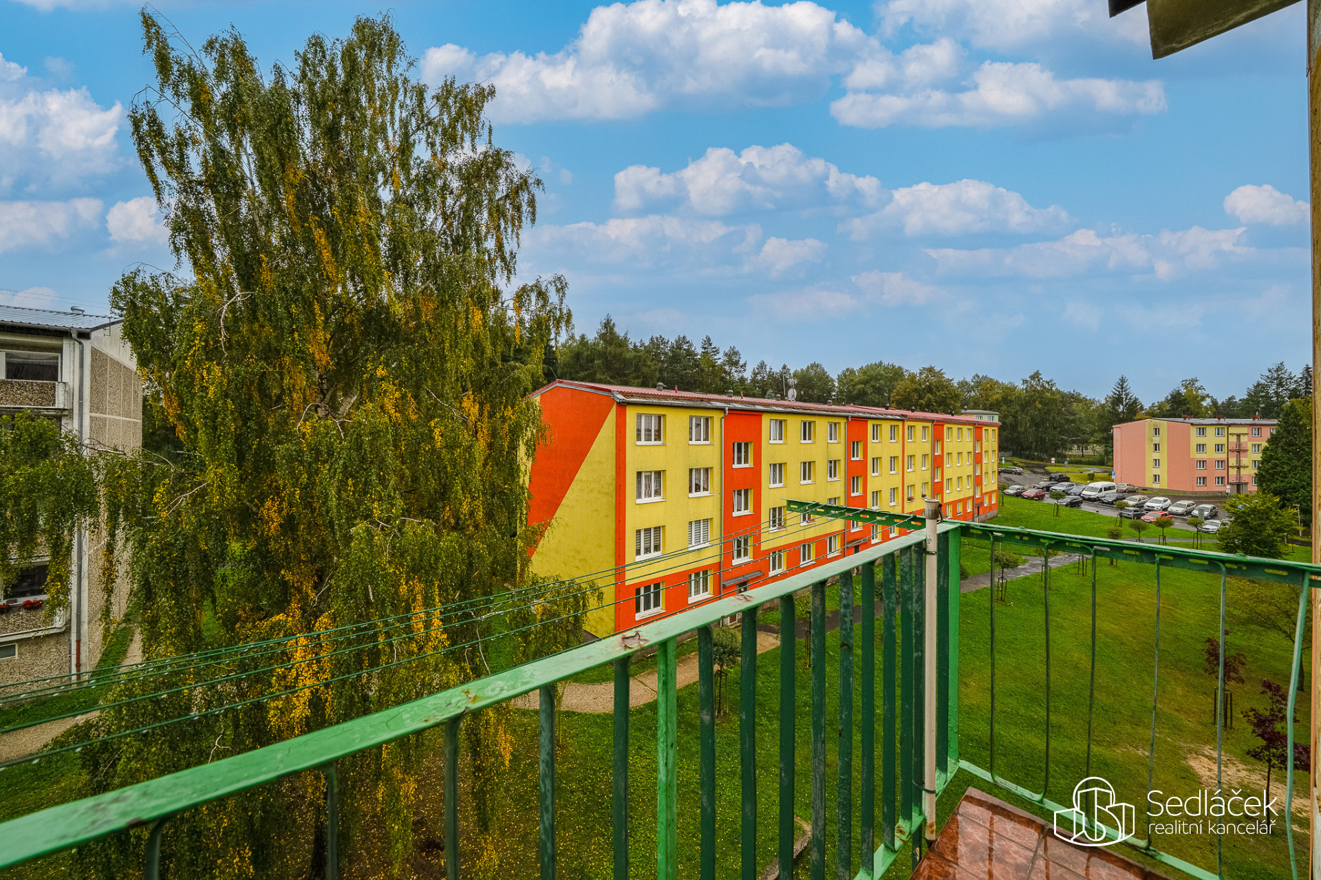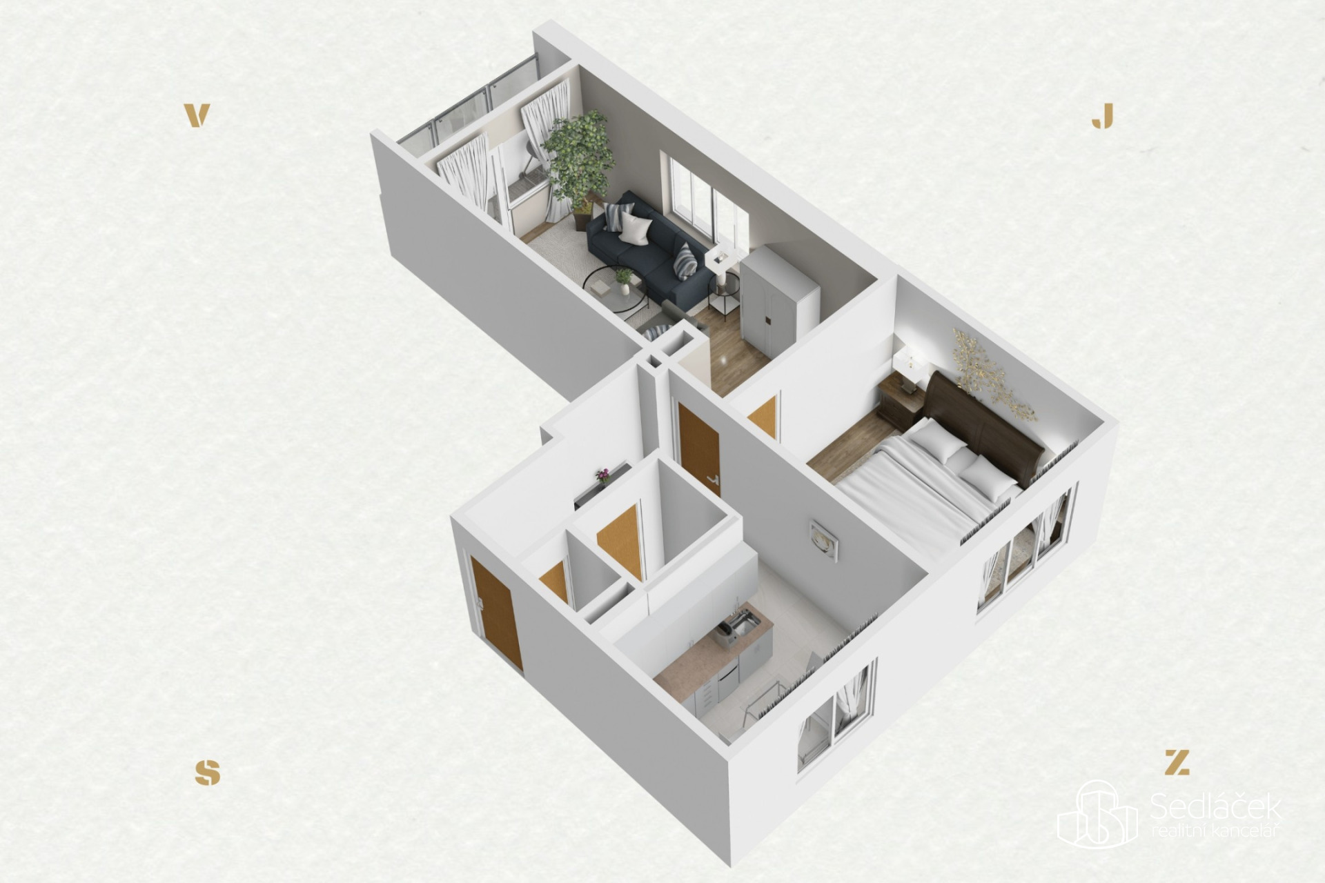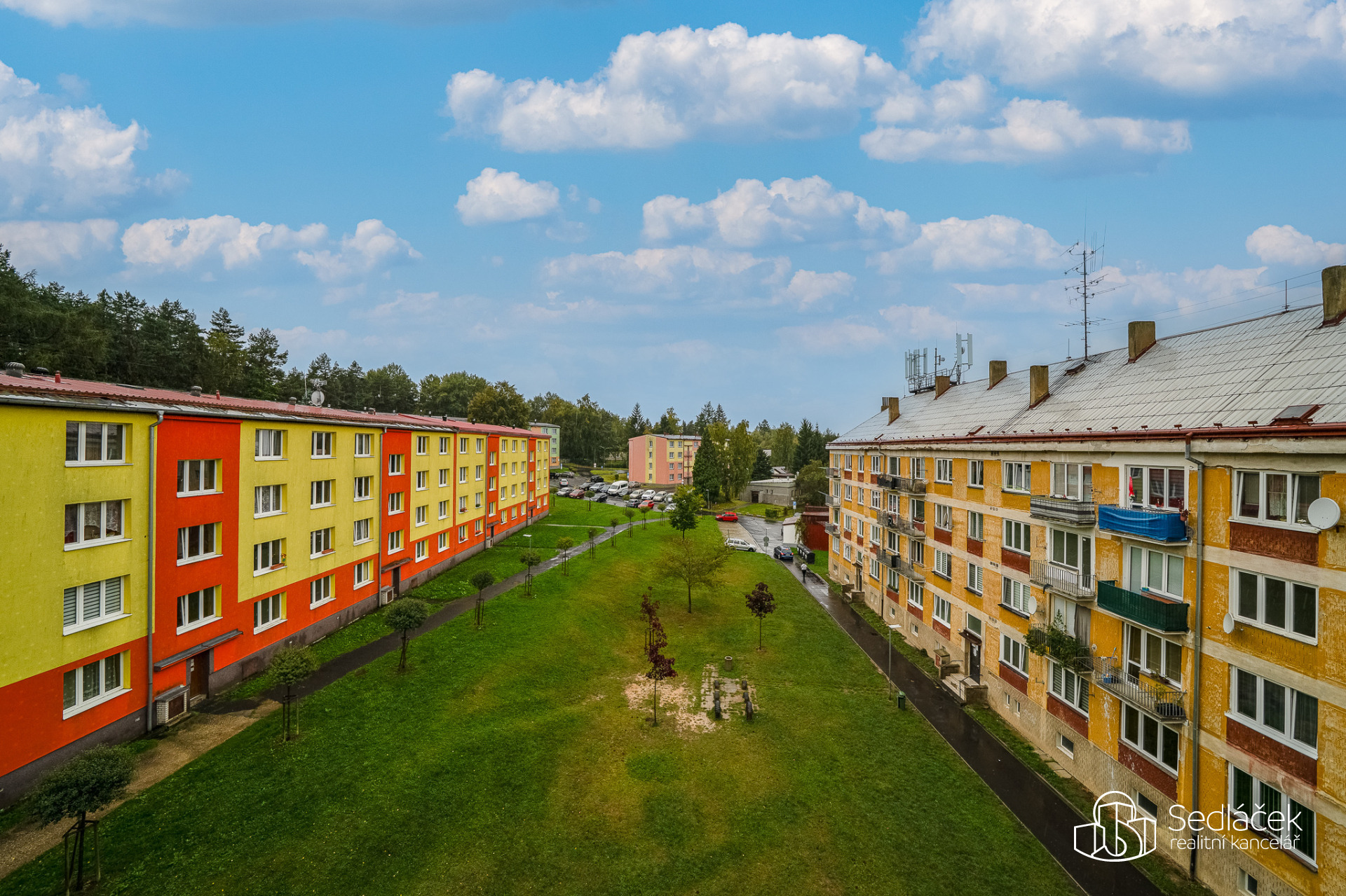 Dispozice: předsíň s vestavěnými skříněmi, samostatné WC, koupelna s vanou, kuchyň s plynovým sporákem a zachovalou linkou, obývací pokoj s balkonem a výhledem do dvou světových stran a ložnice. Jádro je zděné, okna plastová.
