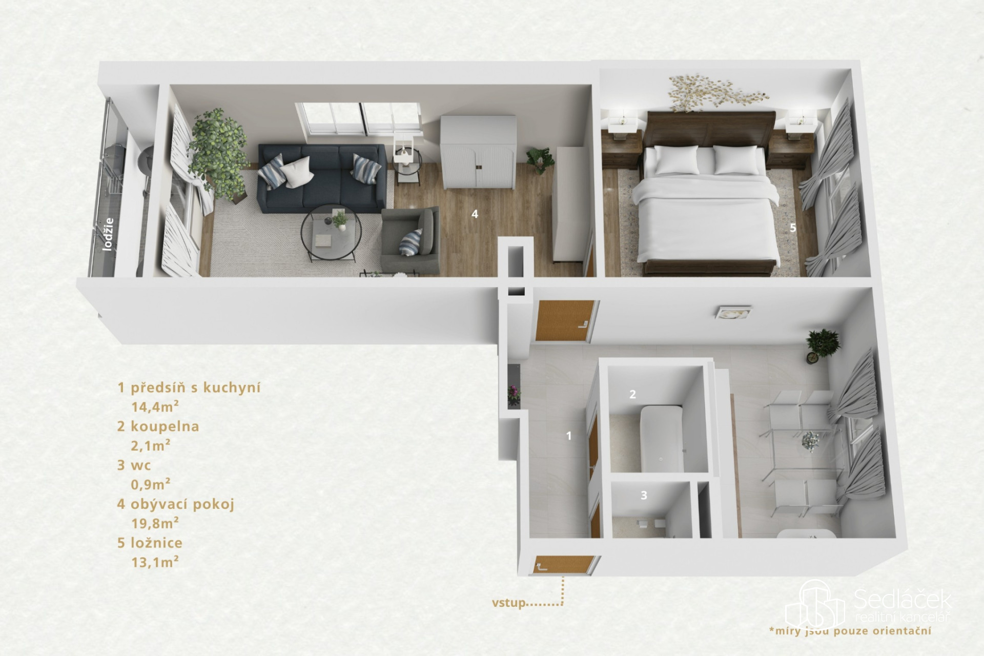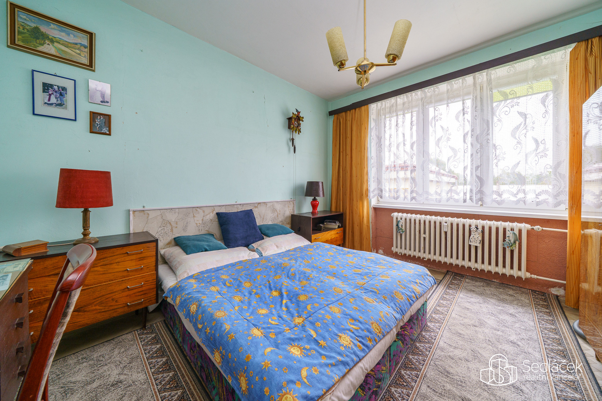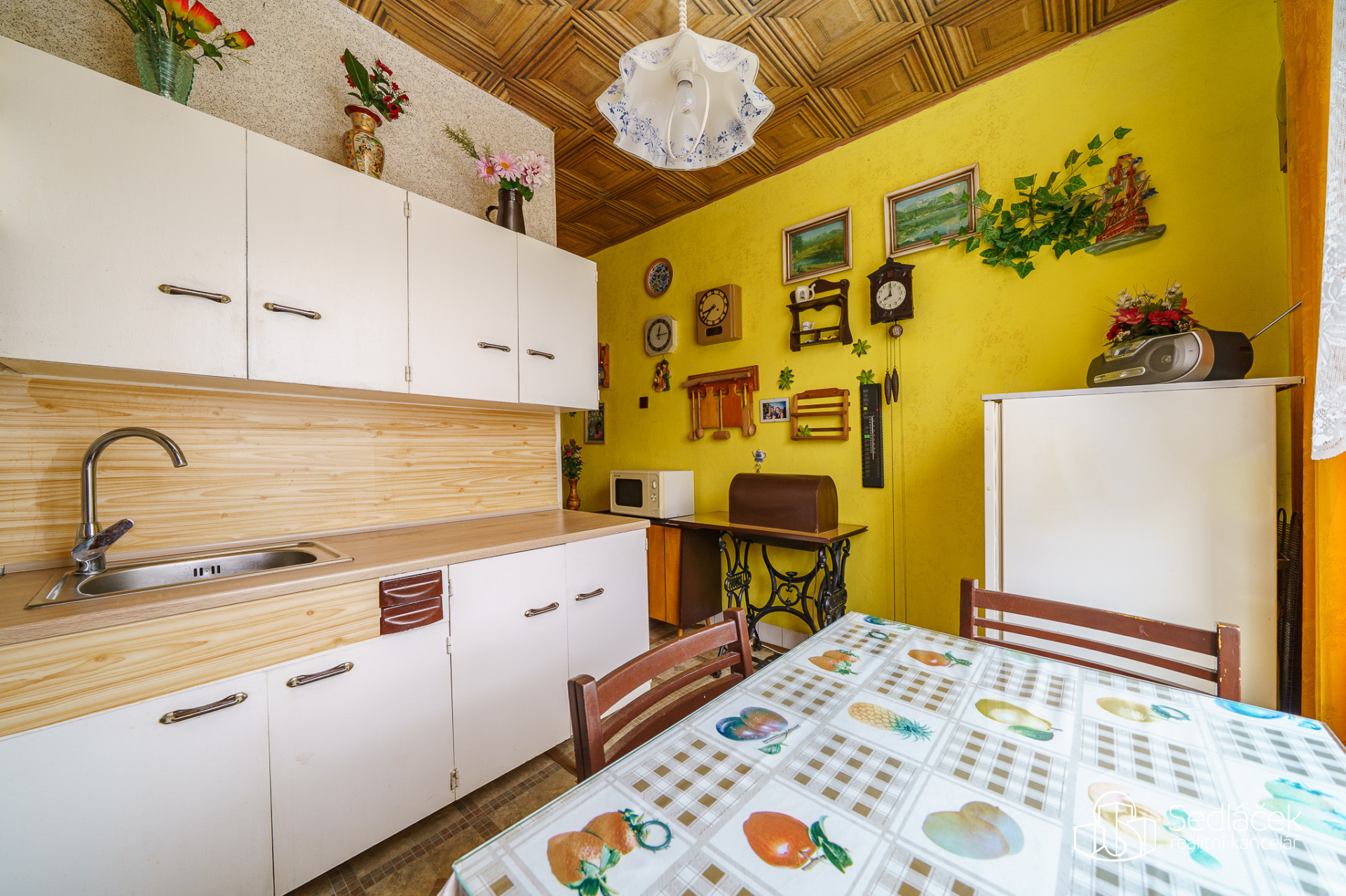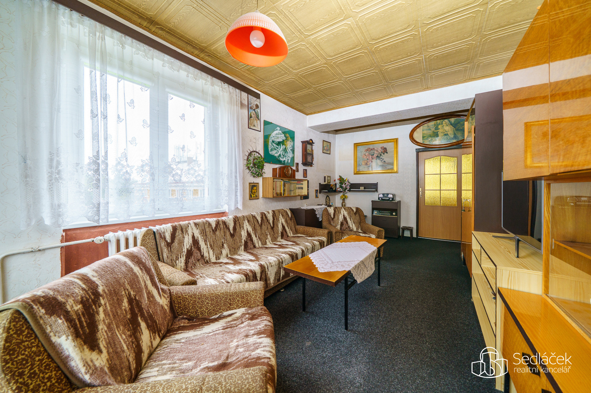 Dispozice: předsíň s vestavěnými skříněmi, samostatné WC, koupelna s vanou, kuchyň s plynovým sporákem a zachovalou linkou, obývací pokoj s balkonem a výhledem do dvou světových stran a ložnice. Jádro je zděné, okna plastová.