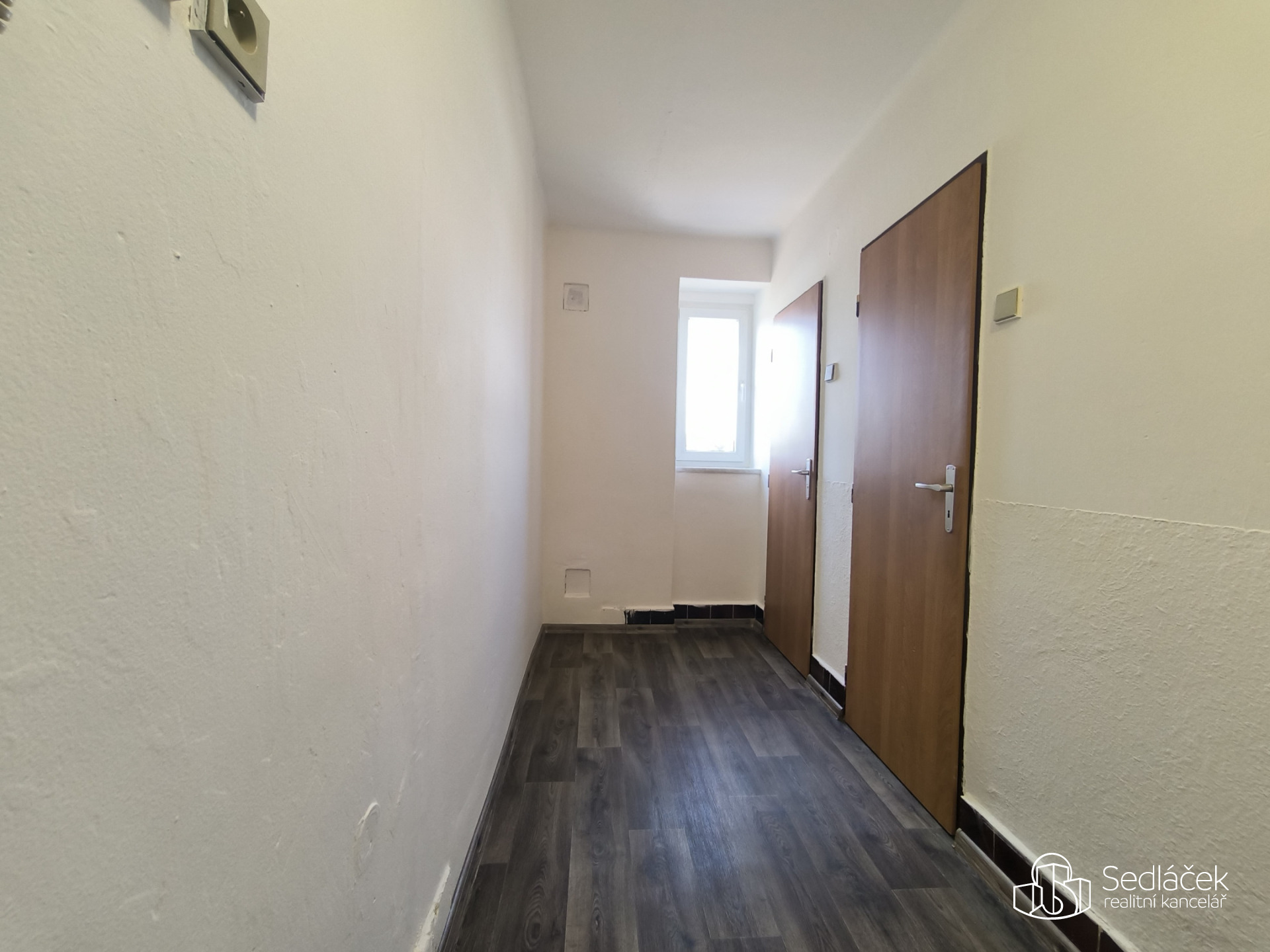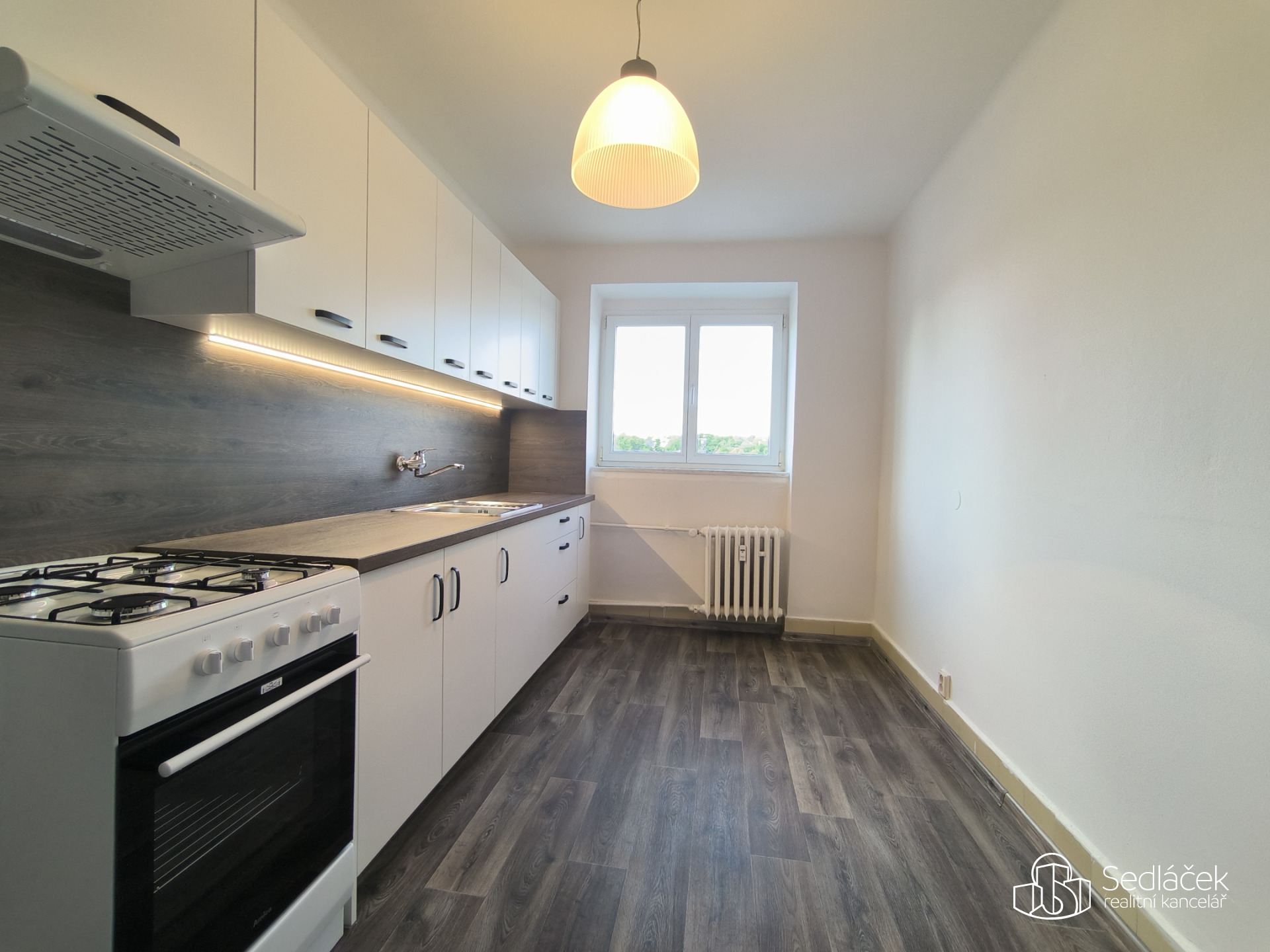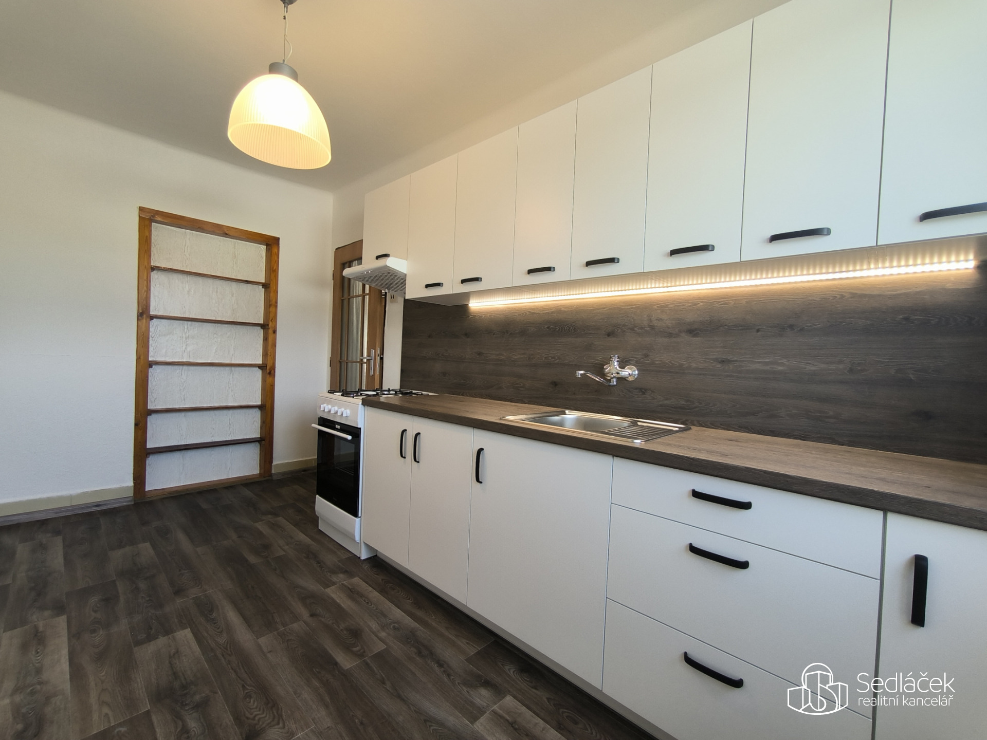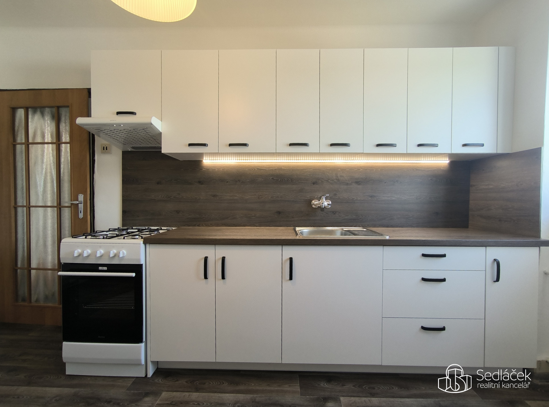 Byt je vybaven novou kuchyňskou linkou a plynovými kamny. Koupelna je s vanou, WC je samostatné. Na podlaze je nové linoleum. Součástí pronájmu je také sklep.