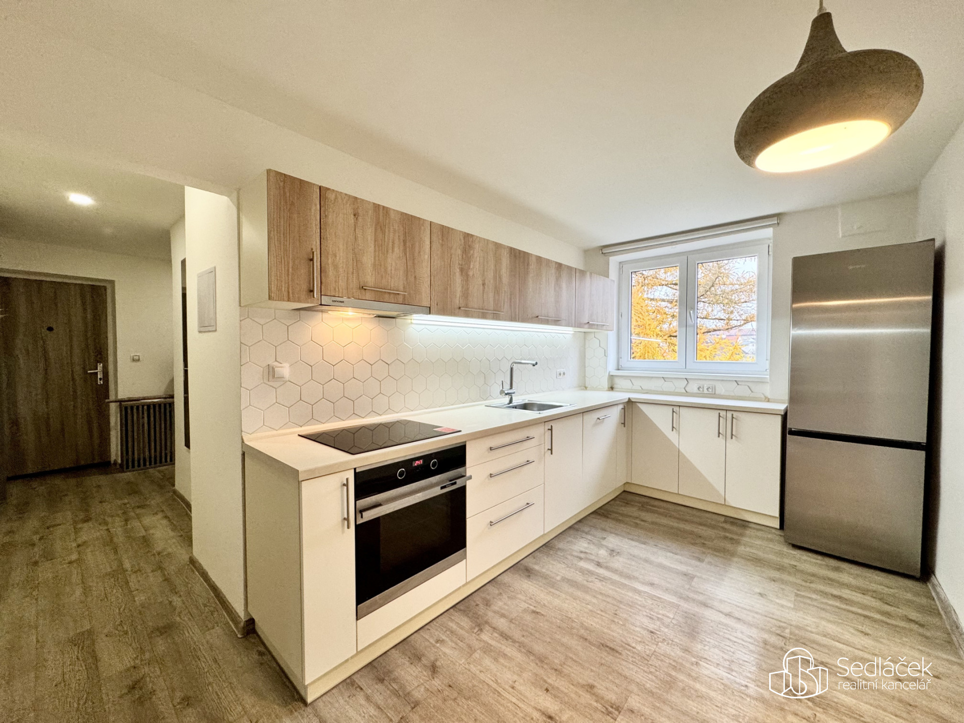 - kuchyňská linka s varnou deskou, troubou, myčkou a lednicí