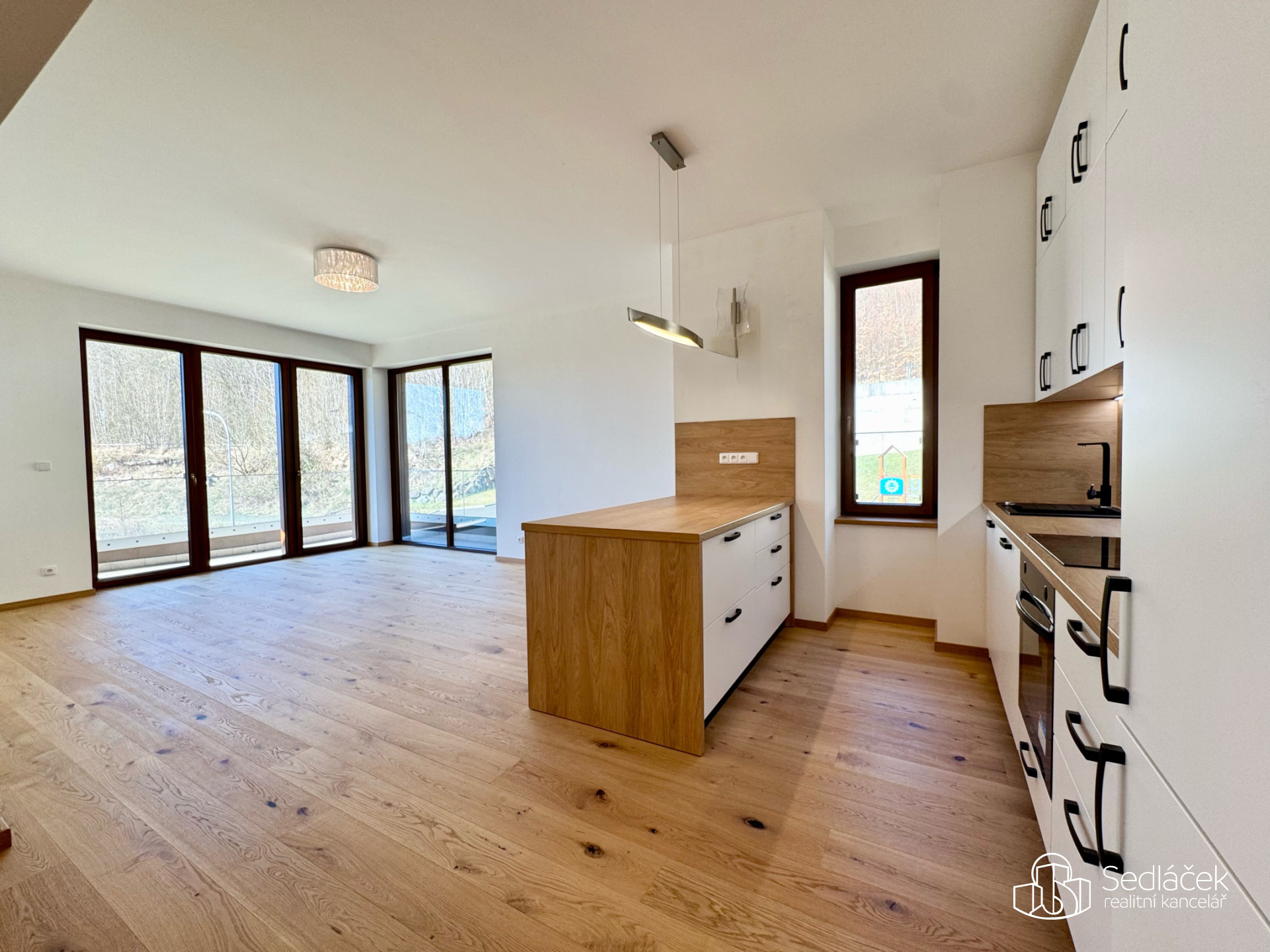 Dispoziční řešení tvoří prostorný obývací pokoj s plně vybavenou kuchyňskou linkou (trouba, varná deska, digestoř, lednice, myčka), samostatná ložnice, koupelna s vanou a toaletou a praktická technická místnost s přípravou pro pračku a sušičku. Interiér doplňují kvalitní dřevěné podlahy, které podtrhují celkový elegantní charakter bytu.