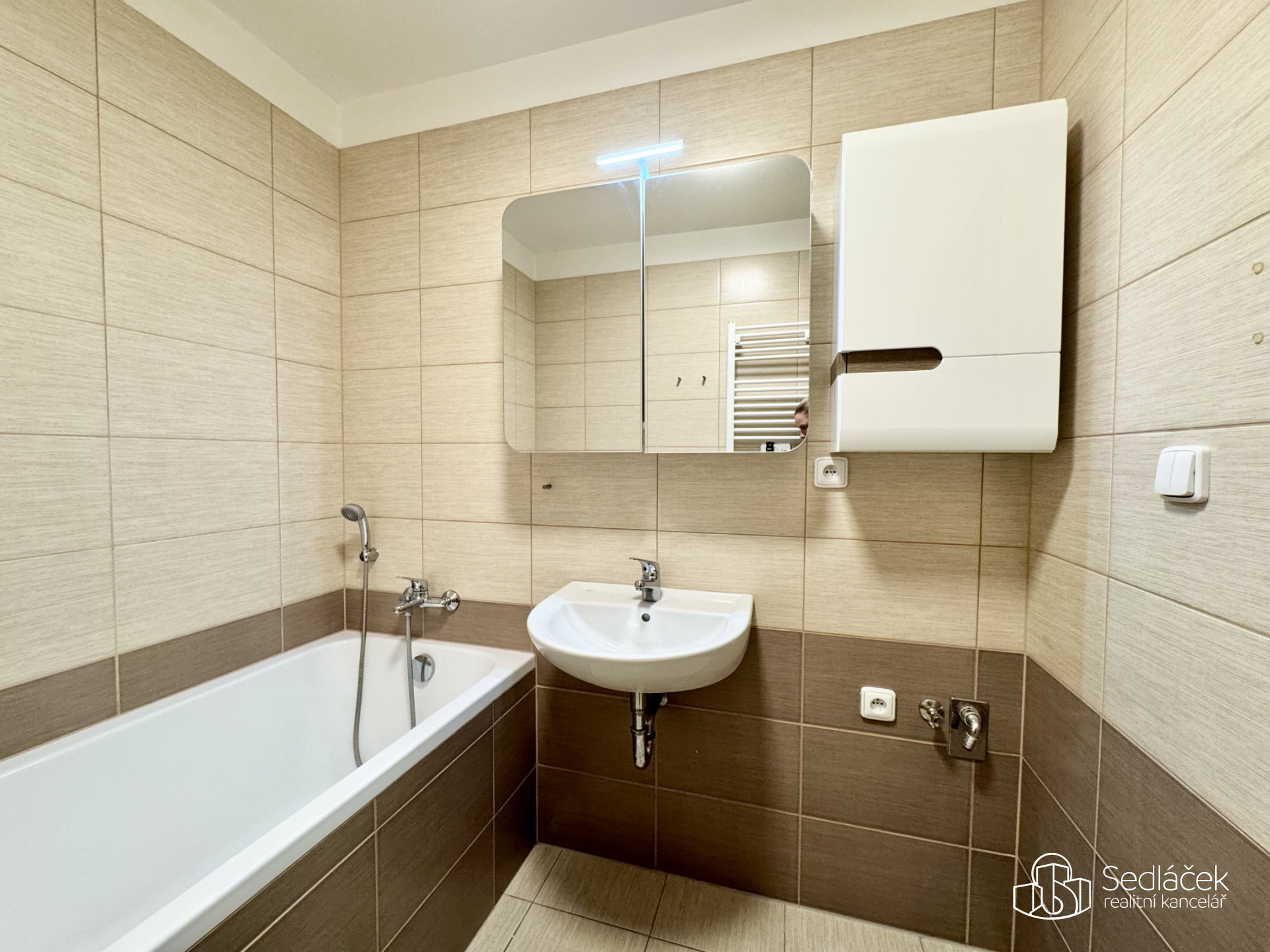 • koupelna s vanou, umyvadlem a závěsnou skříňkou se zrcadlem
