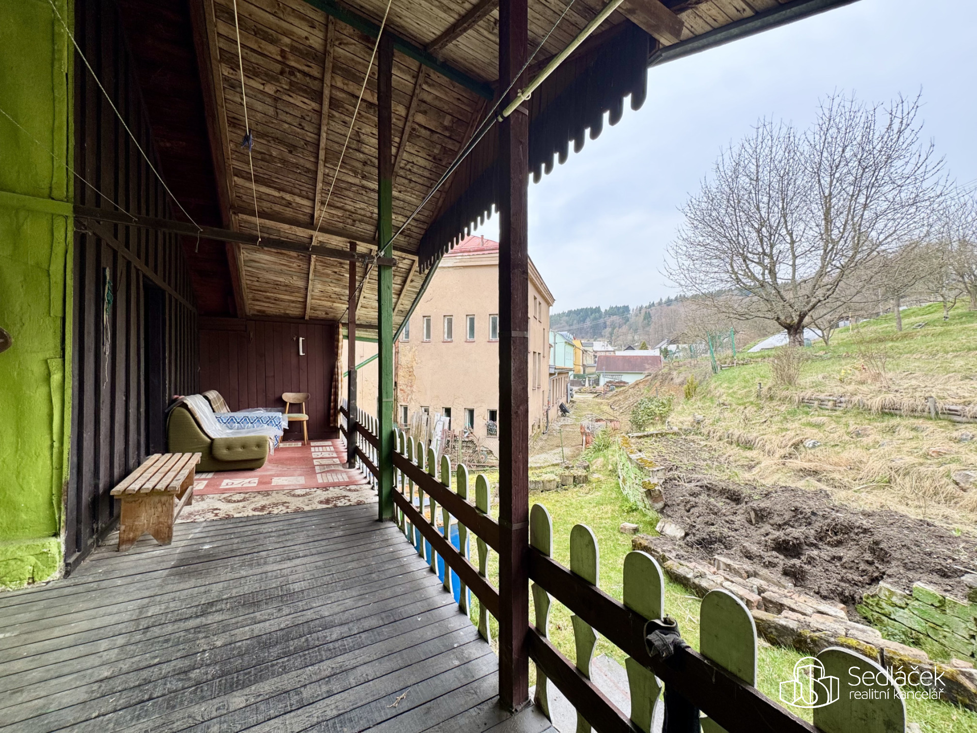 Za domem se nachází svažitá, ale velmi slunná zahrada, ideální pro terasovité úpravy, zahradničení nebo vytvoření klidové zóny pro odpočinek. Díky orientaci a otevřenému prostoru působí pozemek vzdušně a nabízí příjemné výhledy.