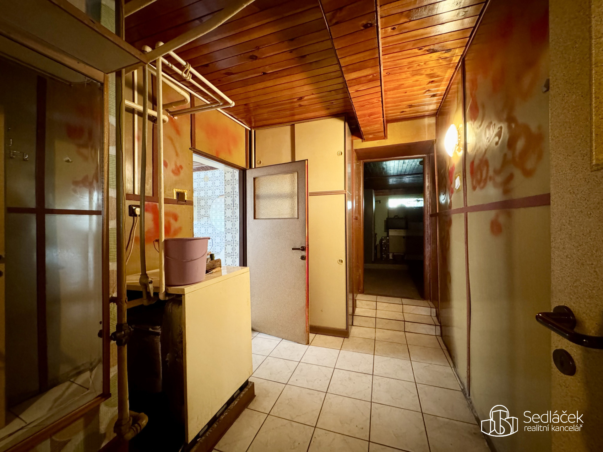 Interiér odpovídá stáří nemovitosti – původní omítky, podlahy i rozvody (elektro, voda, plyn). Vytápění je řešeno plynovými kamny a kamny na tuhá paliva. Revize komína i plynového zařízení byla provedena.